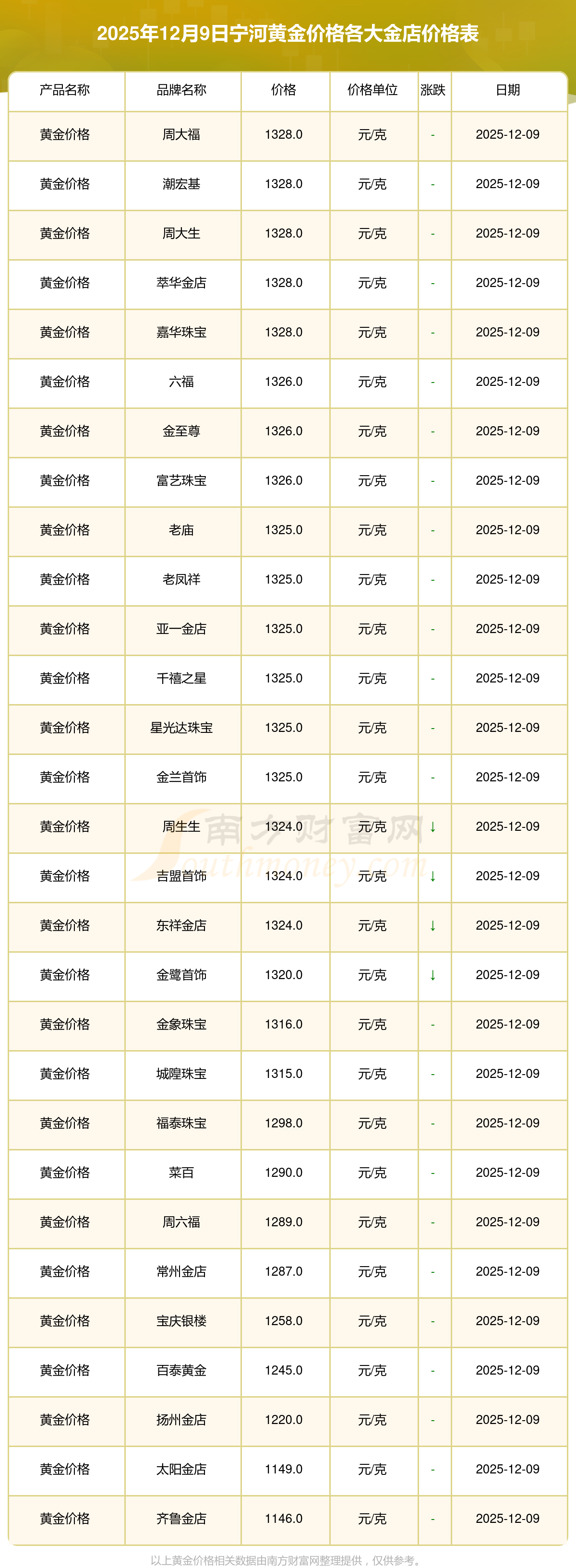 2025年12月9日寧河各大金店黃金價(jià)格表匯總(國(guó)內(nèi)寧河金價(jià)實(shí)時(shí)行情今日多少一克)