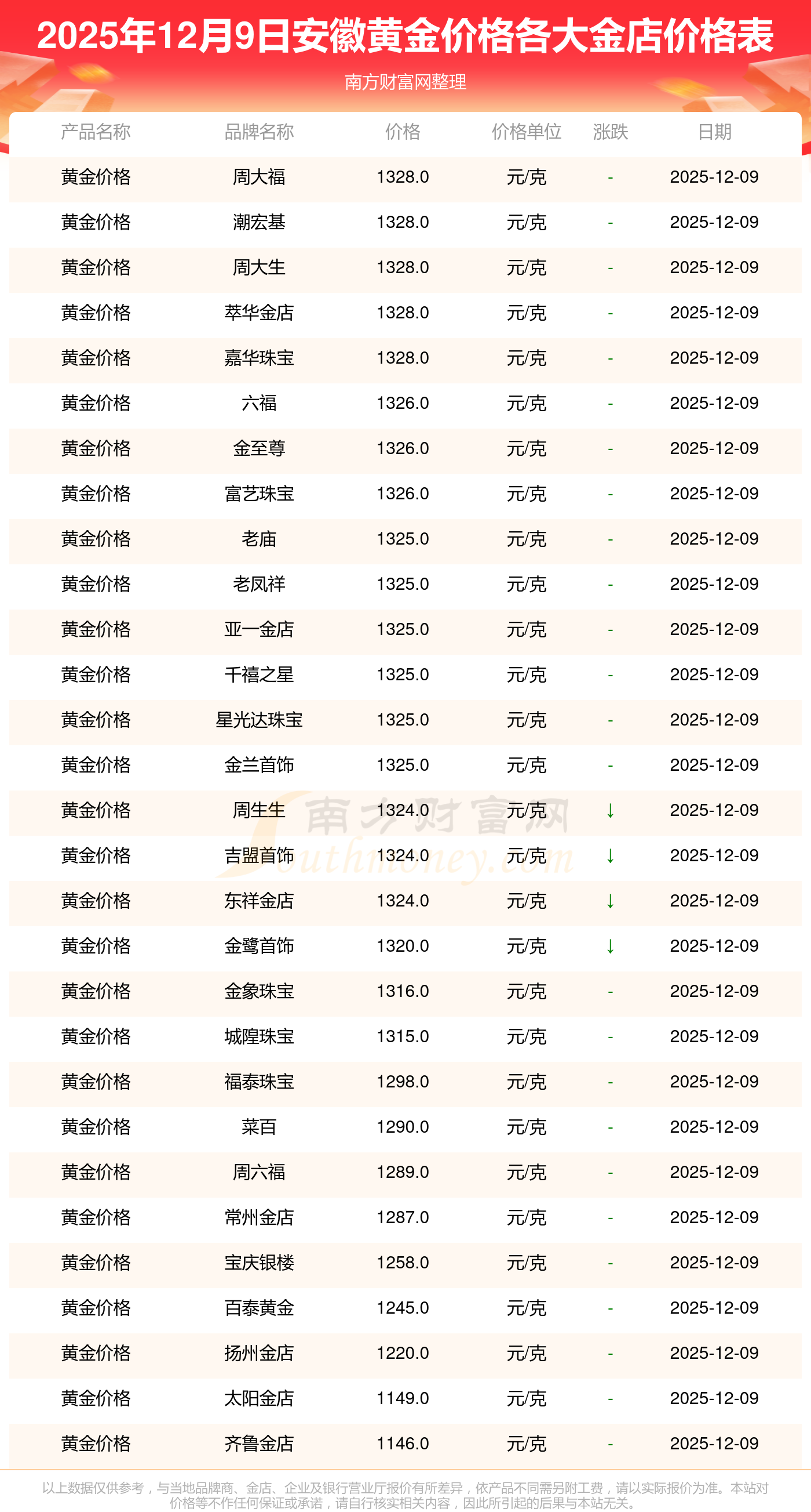2025年12月9日安徽周大福、周大福、周大福、周大福、周大福、周大福、周大福、周六福、周六福、周六福、周六福等各大金店品牌黃金價(jià)格最新價(jià)格行情來了,如下:周大福黃金價(jià)格1328.0元/克,周大福鉑金價(jià)格669.0元/克,周大福飾品金價(jià)(內(nèi)地)1328.0元/克,周大福黃金飾品(香港)46520.0,周大福鉑金價(jià)格(香港)19190.0,周大福金條價(jià)格(香港)41960.0,周大福金條金價(jià)(內(nèi)地)1165.0元/克,周六福黃金價(jià)格1289.0元/克,周六福鉑金價(jià)格613.0元/克,周六福PT999鉑金價(jià)格613.0元/克,周六福金條價(jià)格1184.0元/克。