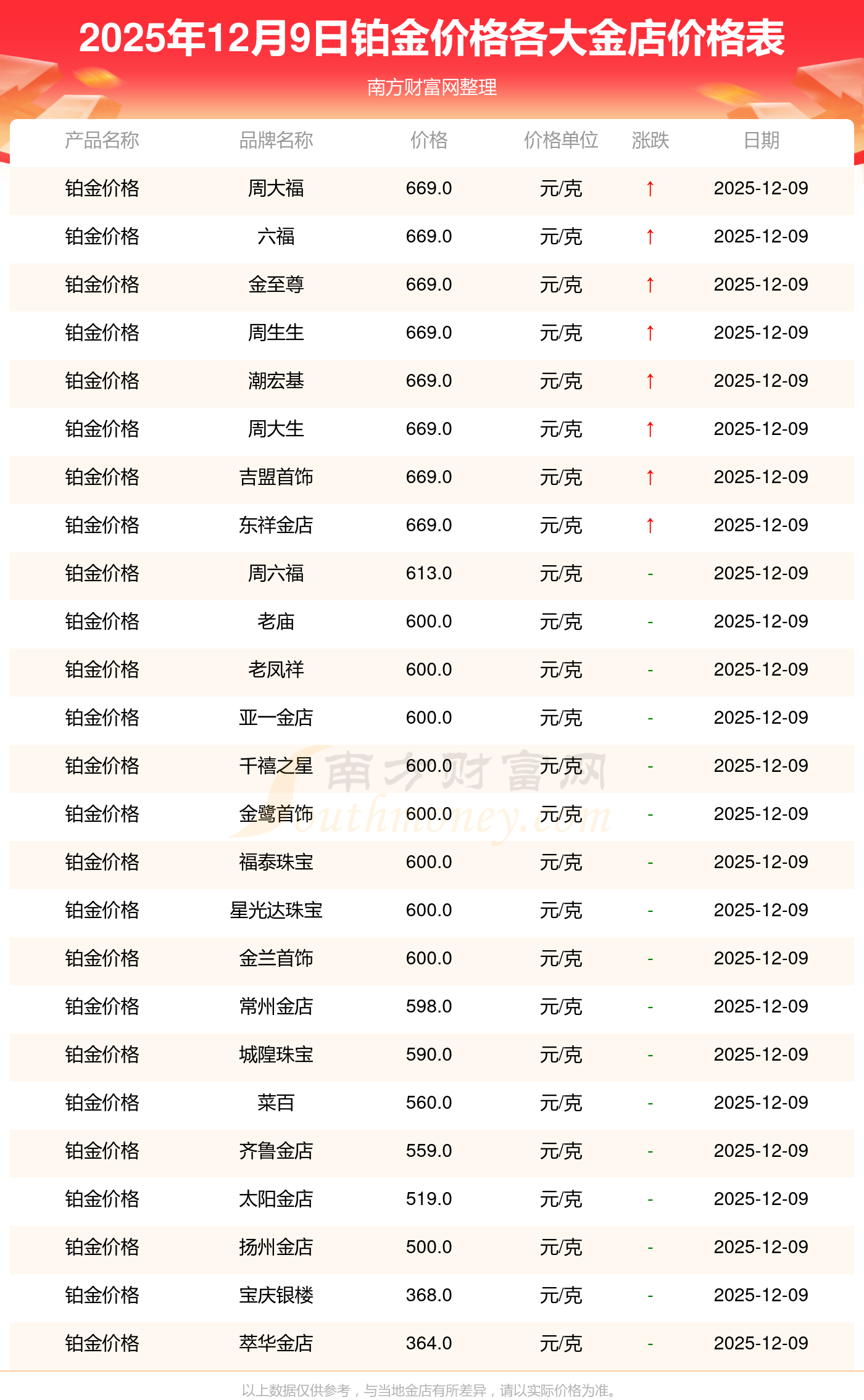 2025年12月9日周大福、周大福、周大福、周大福、周大福、周大福、周大福、周六福、周六福、周六福、周六福等各大金店品牌鉑金價格最新價格如下:周大福黃金價格1328.0元/克,周大福鉑金價格669.0元/克,周大福飾品金價(內(nèi)地)1328.0元/克,周大福黃金飾品(香港)46520.0,周大福鉑金價格(香港)19190.0,周大福金條價格(香港)41960.0,周大福金條金價(內(nèi)地)1165.0元/克,周六福黃金價格1289.0元/克,周六福鉑金價格613.0元/克,周六福PT999鉑金價格613.0元/克,周六福金條價格1184.0元/克。
