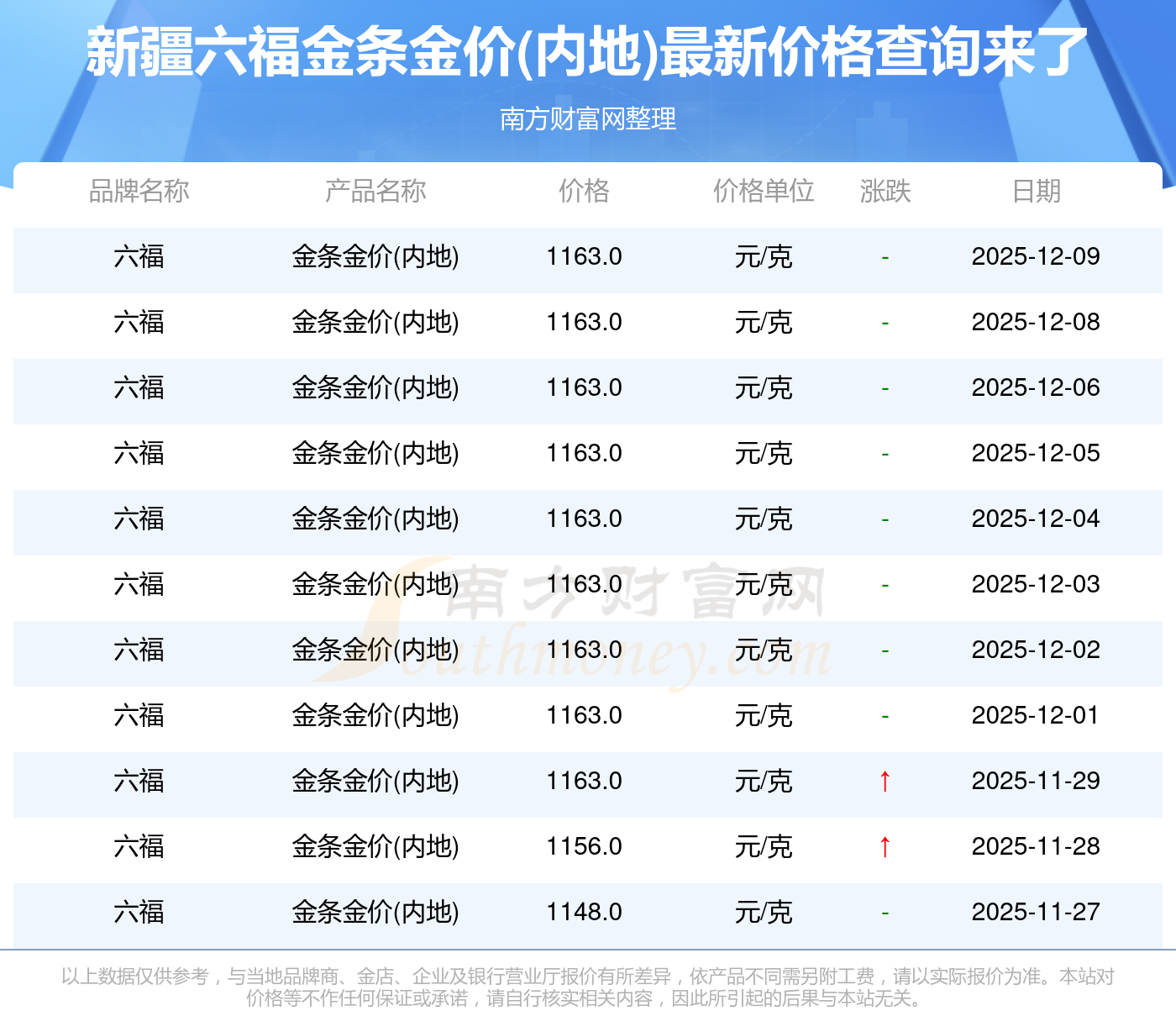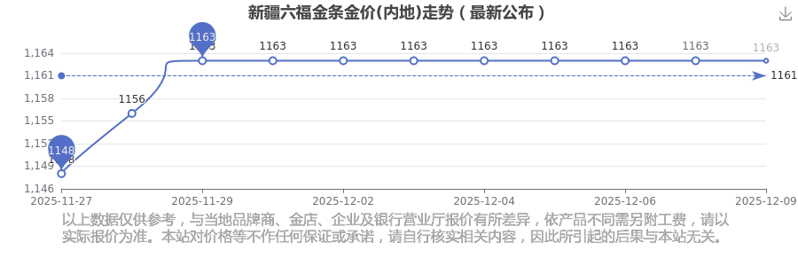 今日2025年12月9日,新疆六福金條金價(jià)(內(nèi)地)為1163.0元/克。