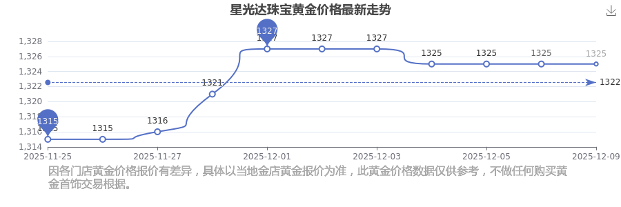 今日(2025年12月9日),星光達珠寶黃金價格最新價格為1325.0元/克。
