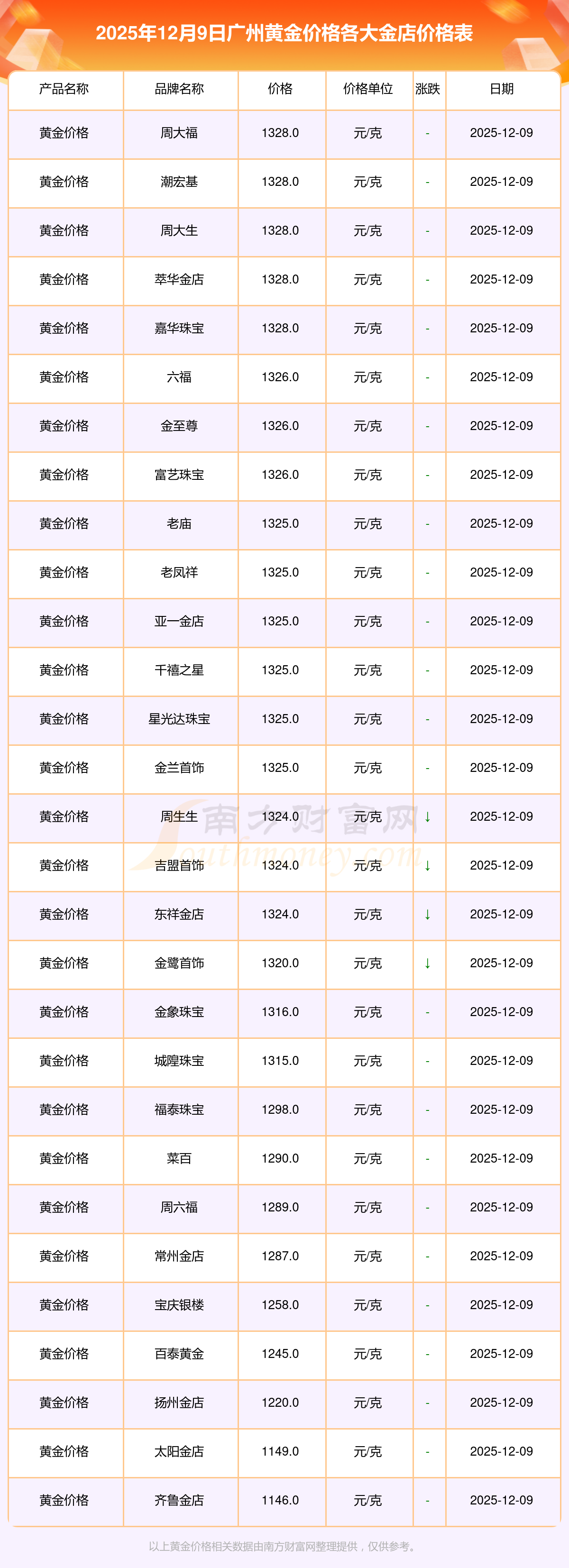 2025年12月9日廣州各大金店黃金價(jià)格最新價(jià)格查詢來了:周大福1328.0元/克,周大福669.0元/克,周大福1328.0元/克,周大福46520.0,周大福19190.0,周大福41960.0,周大福1165.0元/克,周六福1289.0元/克,周六福613.0元/克,周六福613.0元/克,周六福1184.0元/克。