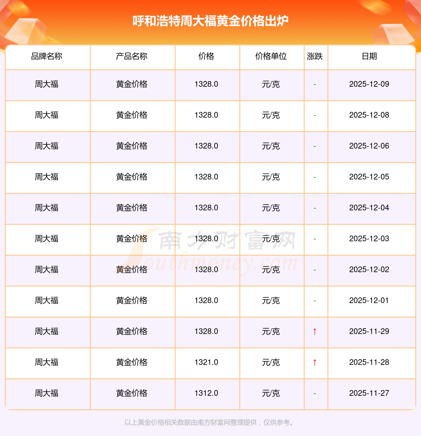 2025年12月9日各大金店黃金價格最新價格:周大福1328.0元/克,周大福669.0元/克,周大福1328.0元/克,周大福46520.0,周大福19190.0,周大福41960.0,周大福1165.0元/克,周六福1289.0元/克,周六福613.0元/克,周六福613.0元/克,周六福1184.0元/克。