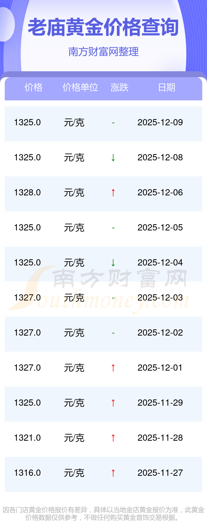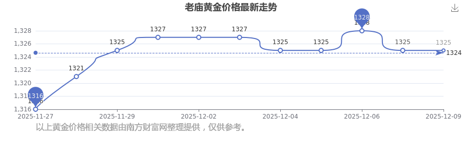 老廟今日黃金價格的最新標(biāo)價為1325.0元/克。