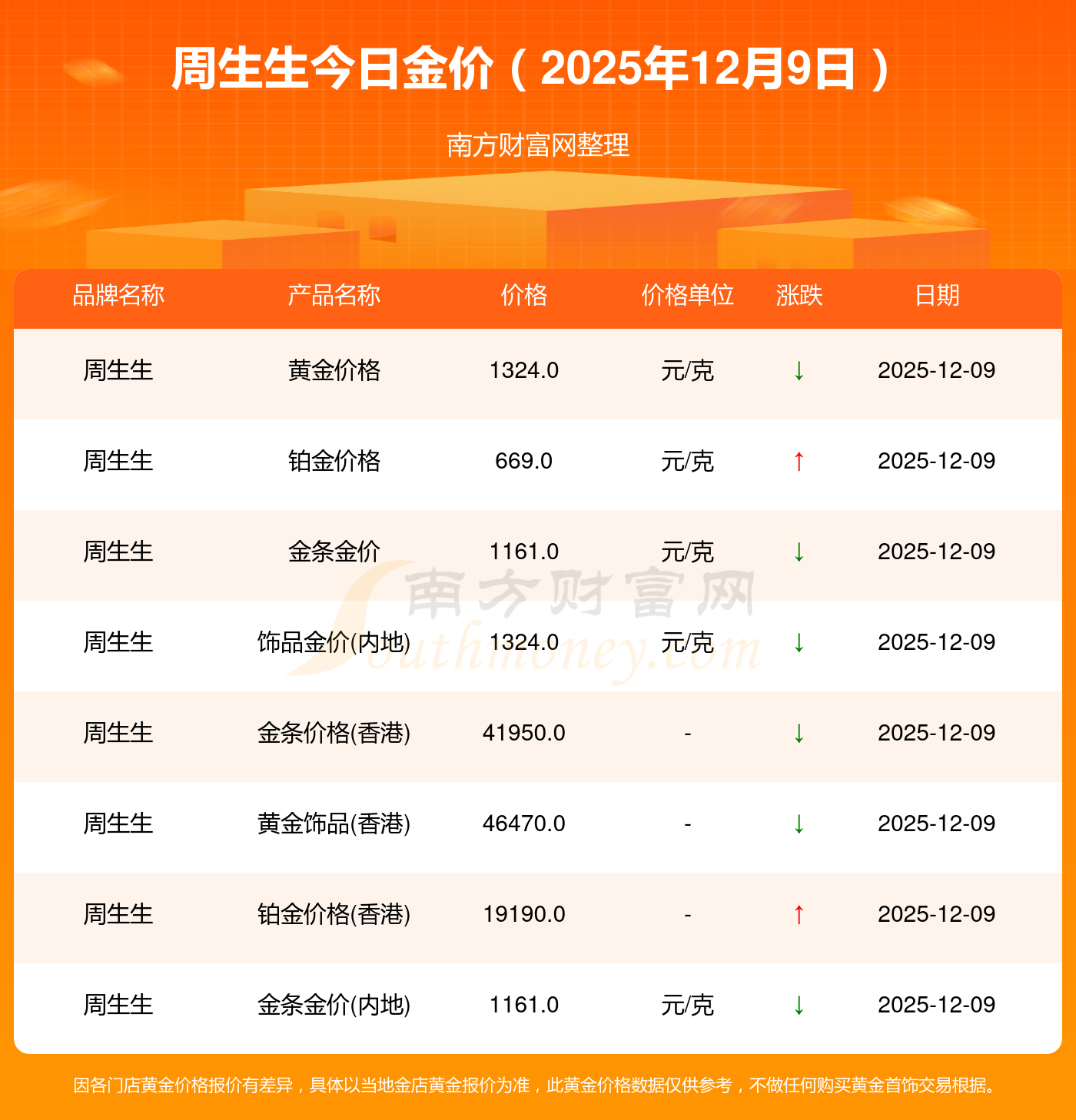 2025年12月9日周生生最新價(jià)格:黃金價(jià)格1328.0元/克,鉑金價(jià)格669.0元/克,飾品金價(jià)(內(nèi)地)1328.0元/克,黃金飾品(香港)46520.0,鉑金價(jià)格(香港)19190.0,金條價(jià)格(香港)41960.0,金條金價(jià)(內(nèi)地)1165.0元/克,黃金價(jià)格1289.0元/克,鉑金價(jià)格613.0元/克,PT999鉑金價(jià)格613.0元/克,金條價(jià)格1184.0元/克。