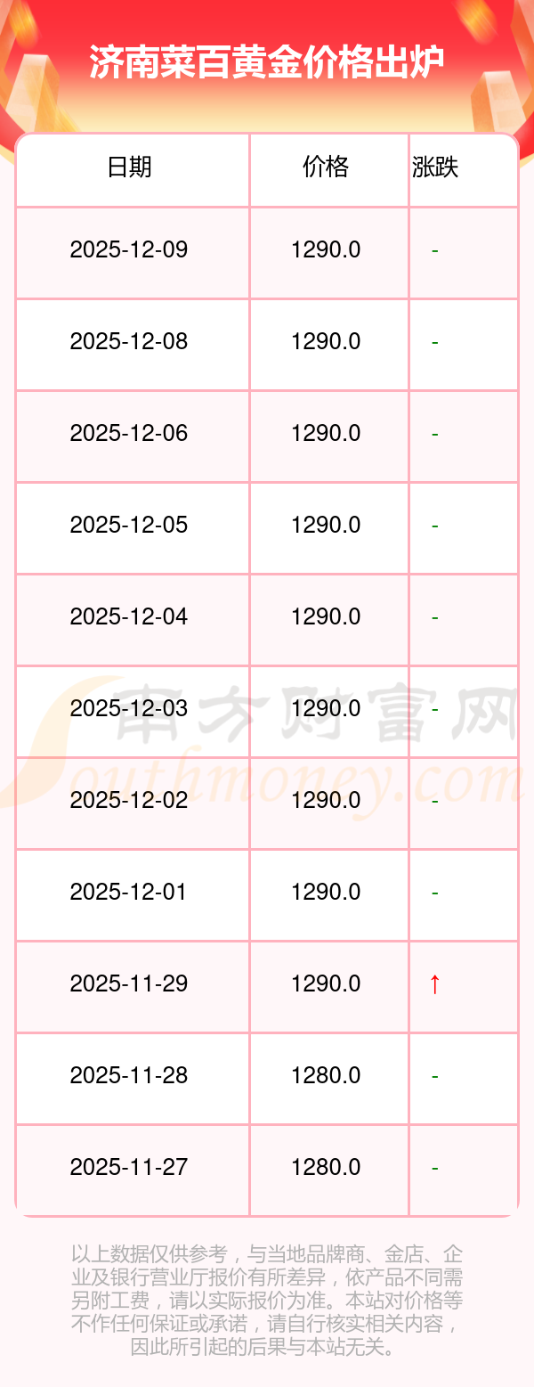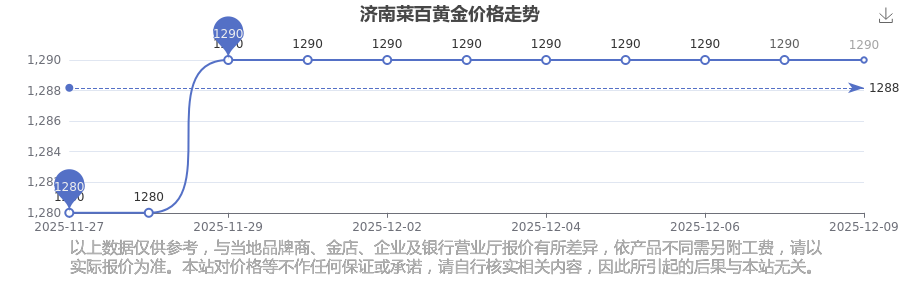 2025年12月9日濟(jì)南菜百黃金價(jià)格是1290.0元/克。