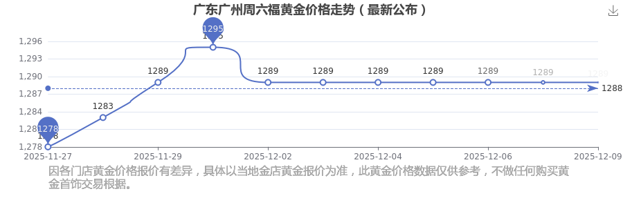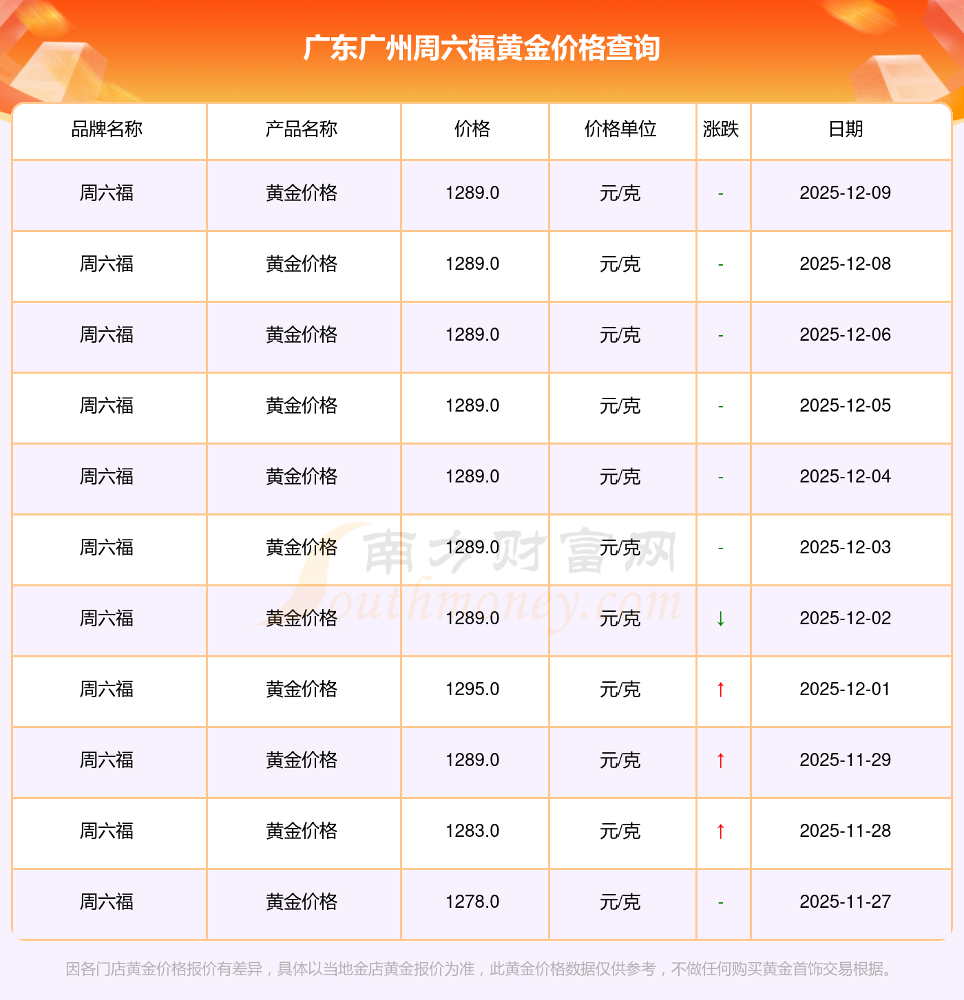 今日廣東廣州周六福黃金價格查詢,廣東廣州周六福在 2025年12月9日,黃金價格的售賣價格是 1289.0元/克。