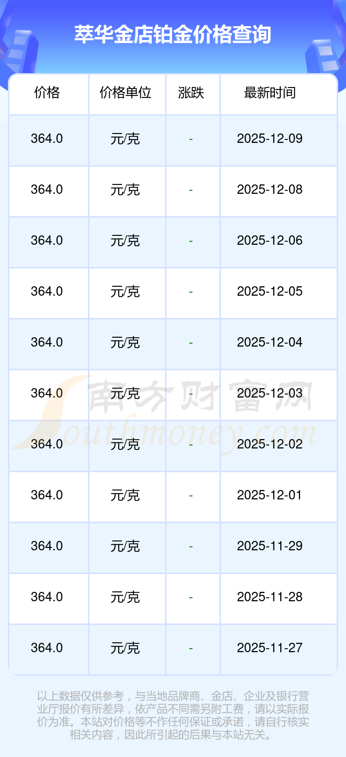 今日萃華金店 鉑金價格,最新確定為364.0元/克。