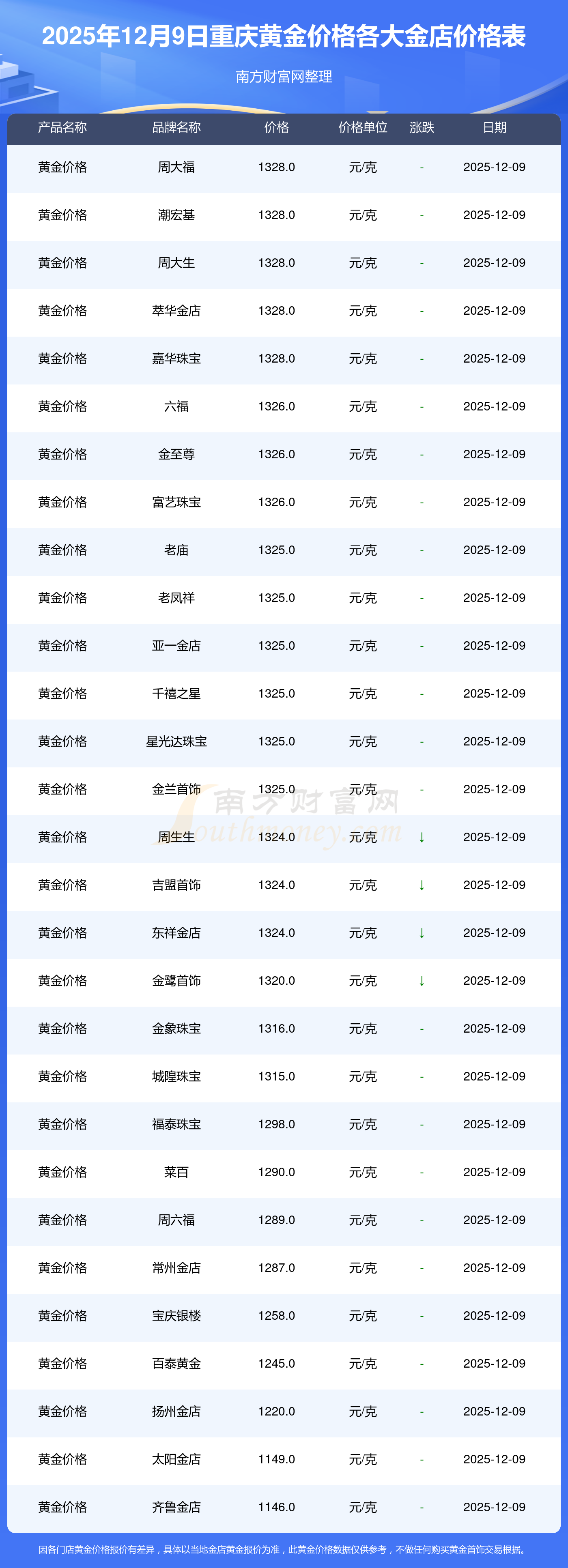 2025年12月9日重慶周大福、周大福、周大福、周大福、周大福、周大福、周大福、周六福、周六福、周六福、周六福等各大金店品牌黃金價(jià)格最新價(jià)格如下:周大福黃金價(jià)格1328.0元/克,周大福鉑金價(jià)格669.0元/克,周大福飾品金價(jià)(內(nèi)地)1328.0元/克,周大福黃金飾品(香港)46520.0,周大福鉑金價(jià)格(香港)19190.0,周大福金條價(jià)格(香港)41960.0,周大福金條金價(jià)(內(nèi)地)1165.0元/克,周六福黃金價(jià)格1289.0元/克,周六福鉑金價(jià)格613.0元/克,周六福PT999鉑金價(jià)格613.0元/克,周六福金條價(jià)格1184.0元/克。