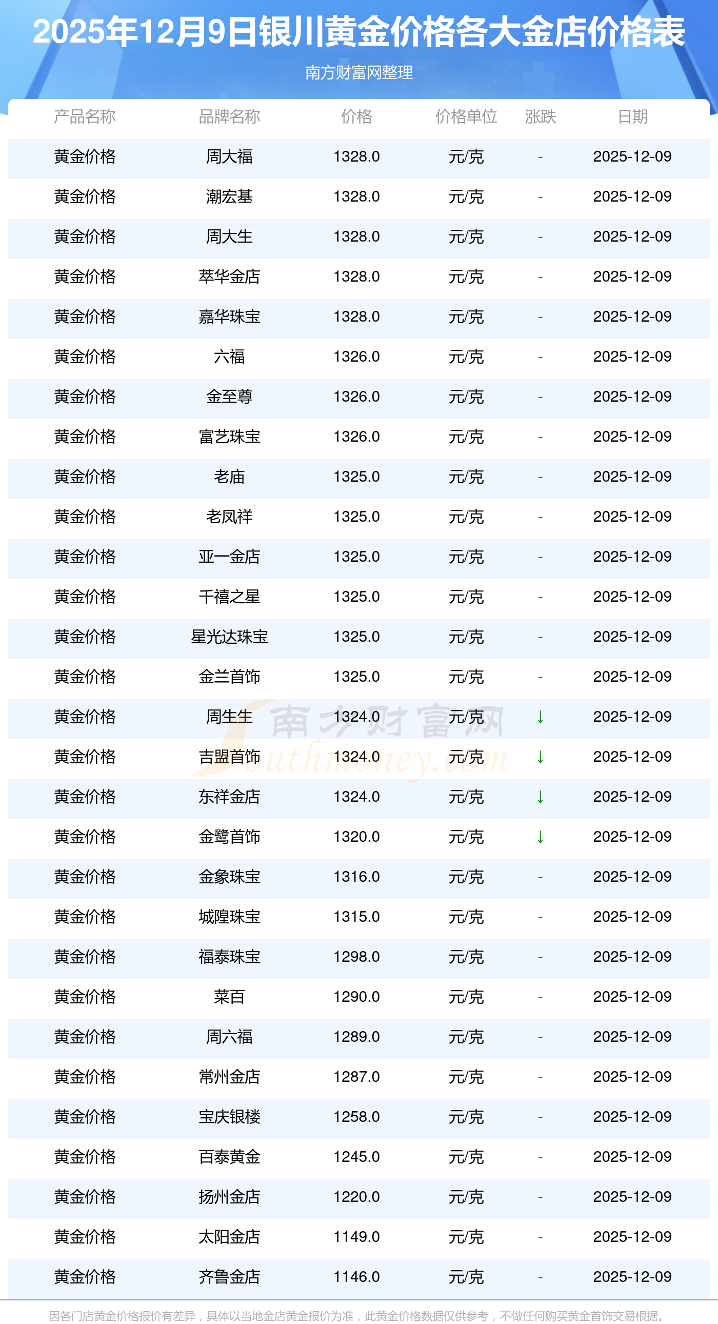 2025年12月9日銀川周大福、周大福、周大福、周大福、周大福、周大福、周大福、周六福、周六福、周六福、周六福等各大金店品牌黃金價格最新價格行情來了,如下:周大福黃金價格1328.0元/克,周大福鉑金價格669.0元/克,周大福飾品金價(內(nèi)地)1328.0元/克,周大福黃金飾品(香港)46520.0,周大福鉑金價格(香港)19190.0,周大福金條價格(香港)41960.0,周大福金條金價(內(nèi)地)1165.0元/克,周六福黃金價格1289.0元/克,周六福鉑金價格613.0元/克,周六福PT999鉑金價格613.0元/克,周六福金條價格1184.0元/克。