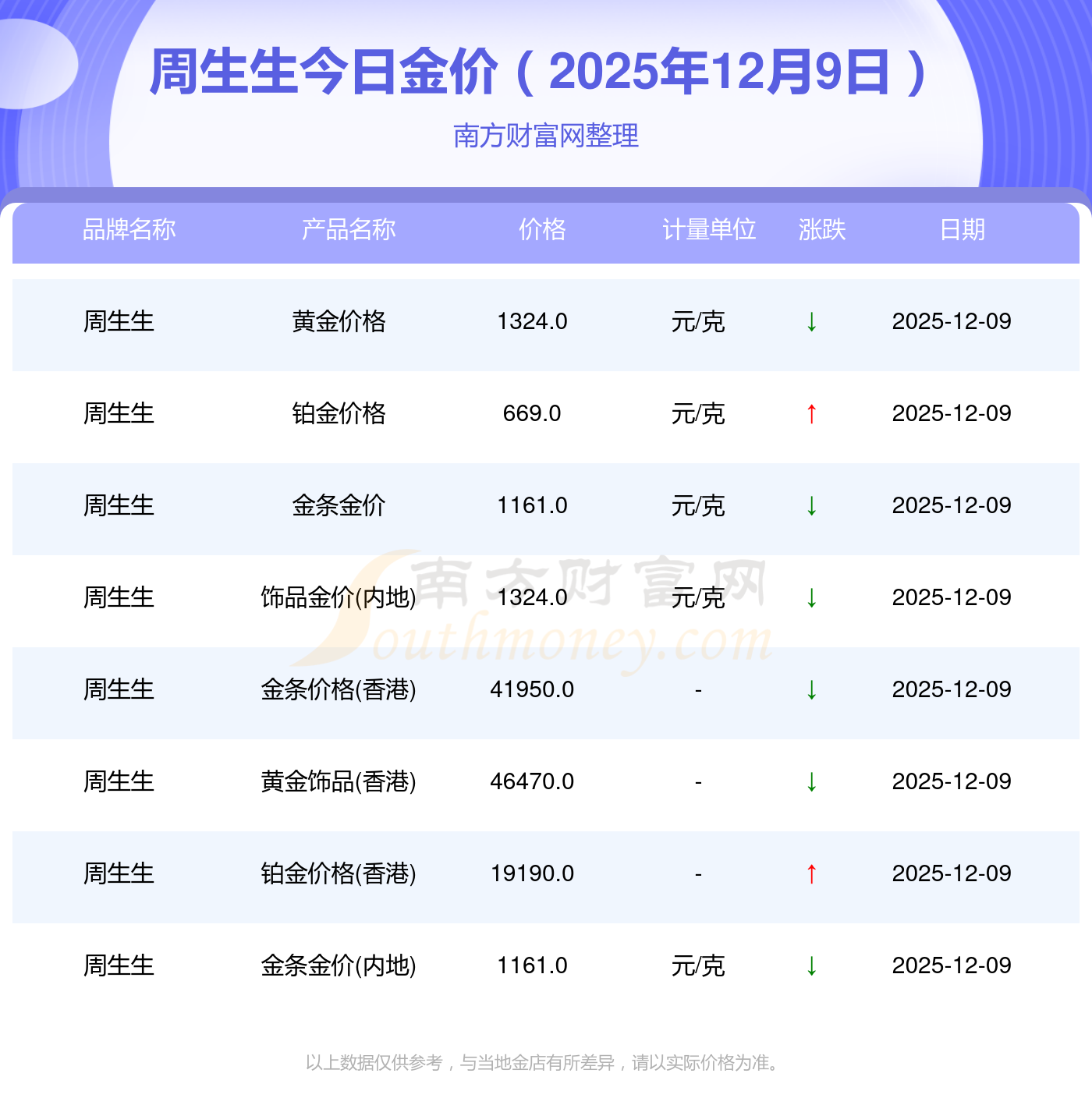 2025年12月9日日照周生生一克黃金對(duì)應(yīng)的價(jià)格是多少?黃金價(jià)格1328.0元/克,鉑金價(jià)格669.0元/克,飾品金價(jià)(內(nèi)地)1328.0元/克,黃金飾品(香港)46520.0,鉑金價(jià)格(香港)19190.0,金條價(jià)格(香港)41960.0,金條金價(jià)(內(nèi)地)1165.0元/克,黃金價(jià)格1289.0元/克,鉑金價(jià)格613.0元/克,PT999鉑金價(jià)格613.0元/克,金條價(jià)格1184.0元/克。