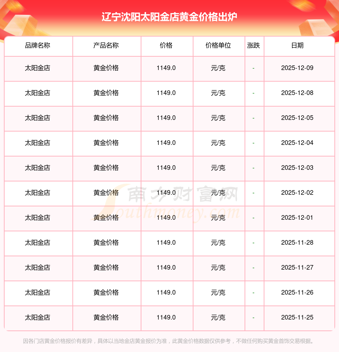 今日遼寧沈陽太陽金店黃金價格公布今日黃金的克重價格是多少今日遼寧沈陽太陽金店黃金價格最新為:1149.0元/克。