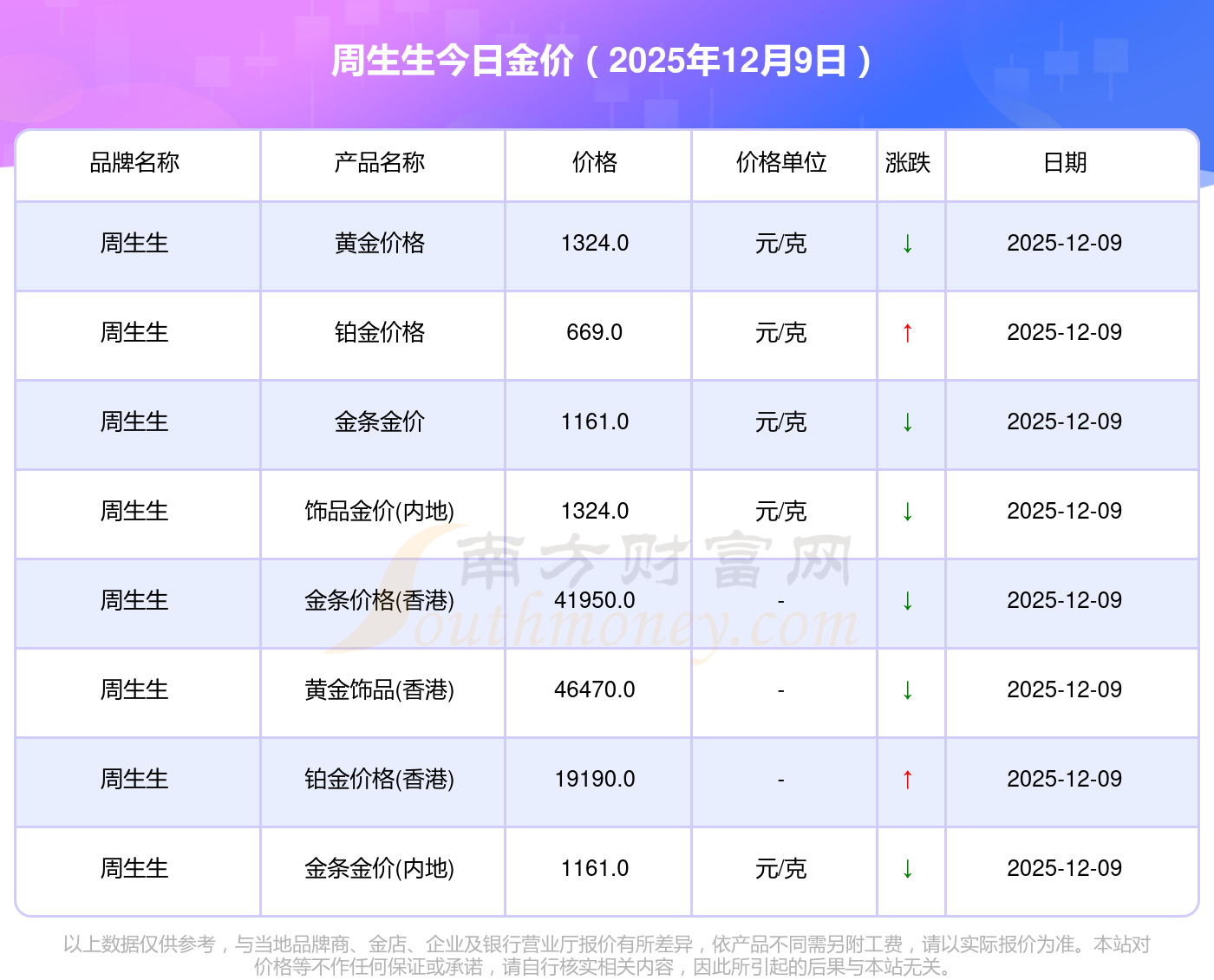 2025年12月9日,周大福、周大福、周大福、周大福、周大福、周大福、周大福、周六福、周六福、周六福、周六福等各大金店品牌黃金價格今日價格如下:周大福1328.0元/克、周大福669.0元/克、周大福1328.0元/克、周大福46520.0、周大福19190.0、周大福41960.0、周大福1165.0元/克、周六福1289.0元/克、周六福613.0元/克、周六福613.0元/克、周六福1184.0元/克。