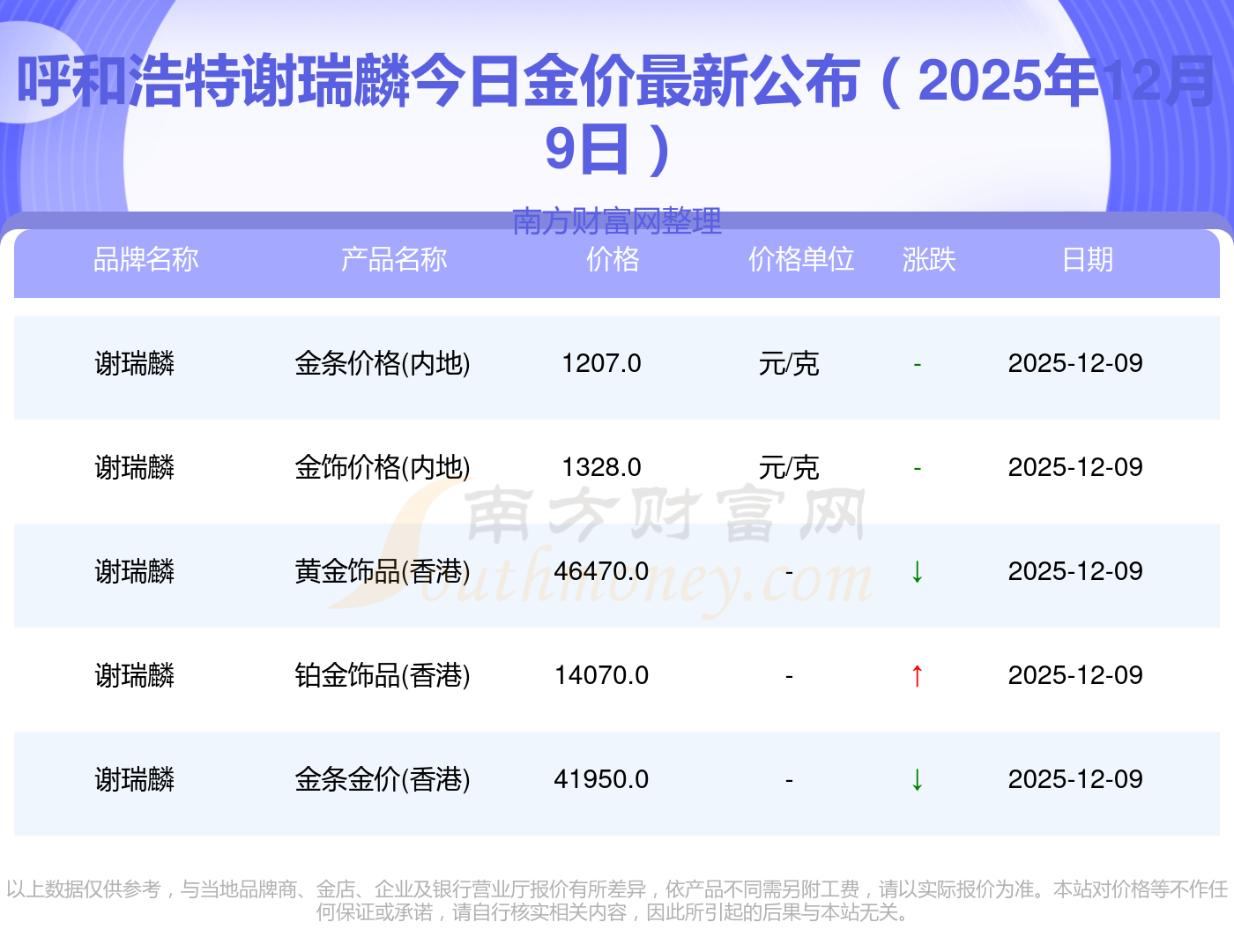 2025年12月9日呼和浩特謝瑞麟金價(jià)查詢:黃金價(jià)格1328.0元/克,鉑金價(jià)格669.0元/克,飾品金價(jià)(內(nèi)地)1328.0元/克,黃金飾品(香港)46520.0,鉑金價(jià)格(香港)19190.0,金條價(jià)格(香港)41960.0,金條金價(jià)(內(nèi)地)1165.0元/克,黃金價(jià)格1289.0元/克,鉑金價(jià)格613.0元/克,PT999鉑金價(jià)格613.0元/克,金條價(jià)格1184.0元/克。