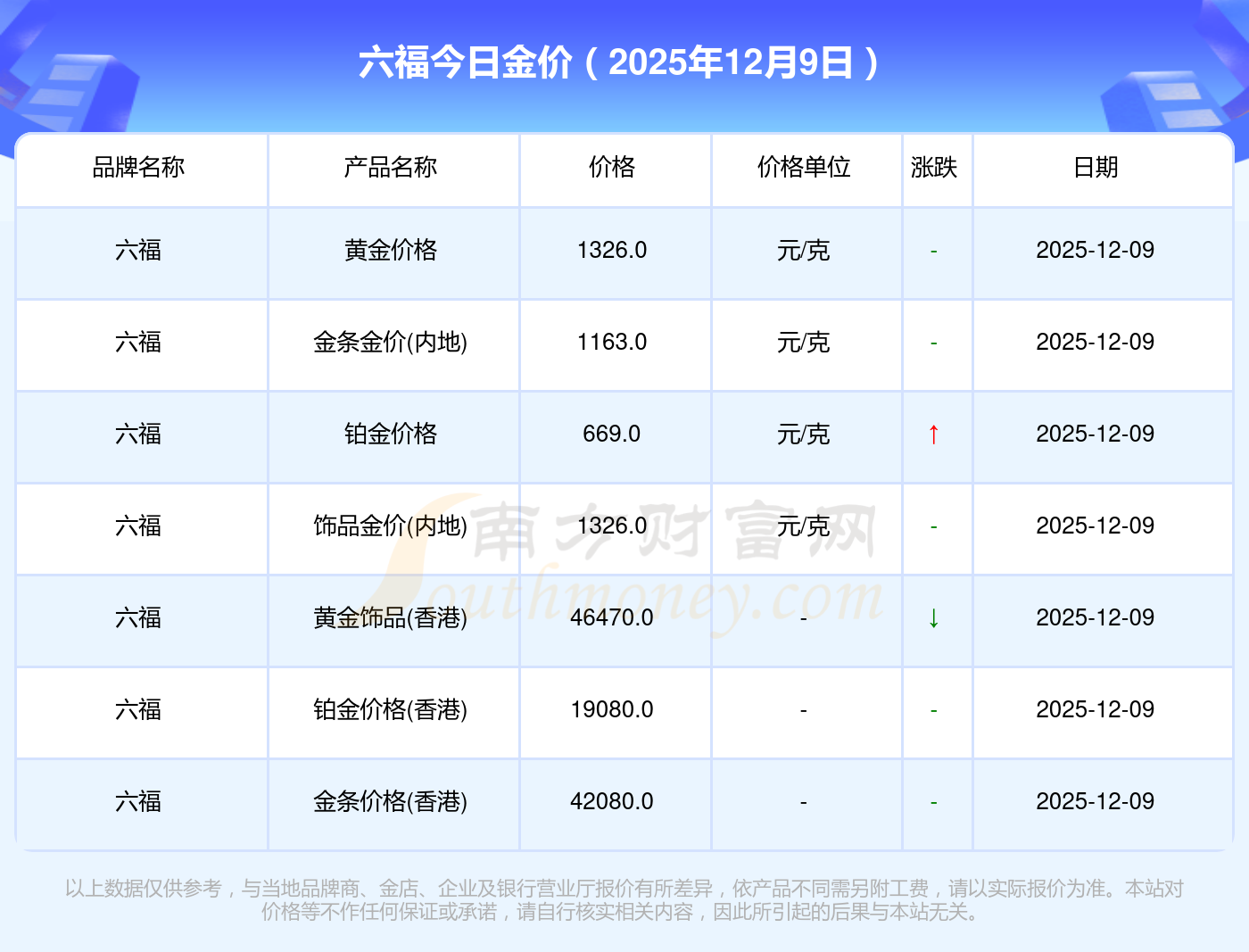 現(xiàn)在六福黃金價(jià)格是多少錢1克_2025年六福今日金價(jià)是多少錢一克,最新六福查詢,2025年12月9日六福黃金價(jià)格現(xiàn)在每克多少錢?最新六福黃金價(jià)格報(bào)價(jià)公布,一起來看看吧!