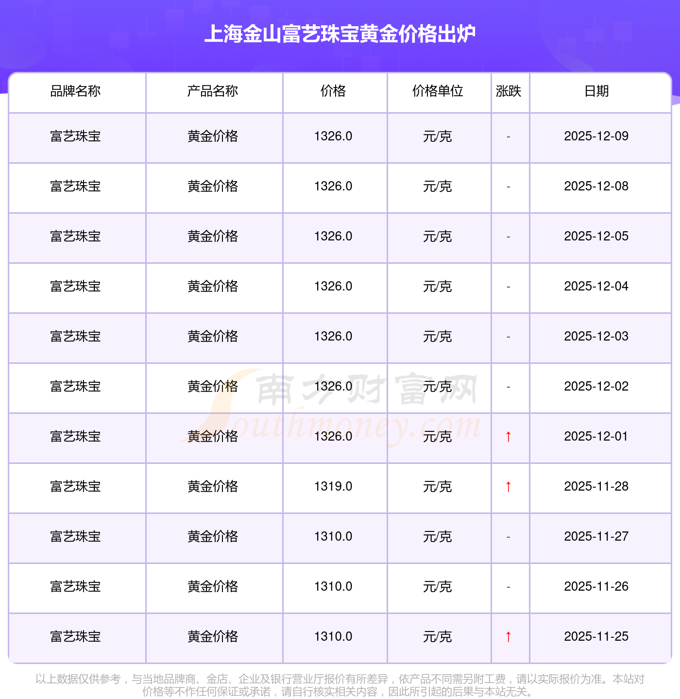 2025年12月9日當(dāng)天,上海金山富藝珠寶黃金價(jià)格的單價(jià)是 1326.0元/克。