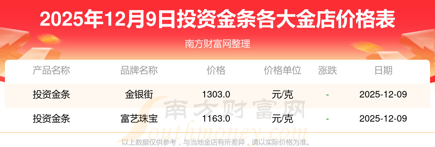 今天是2025年12月9日,周大福、周大福、周大福、周大福、周大福、周大福、周大福、周六福、周六福、周六福、周六福等各大金店品牌投資金條最新價格如下:周大福1328.0元/克、周大福669.0元/克、周大福1328.0元/克、周大福46520.0、周大福19190.0、周大福41960.0、周大福1165.0元/克、周六福1289.0元/克、周六福613.0元/克、周六福613.0元/克、周六福1184.0元/克。