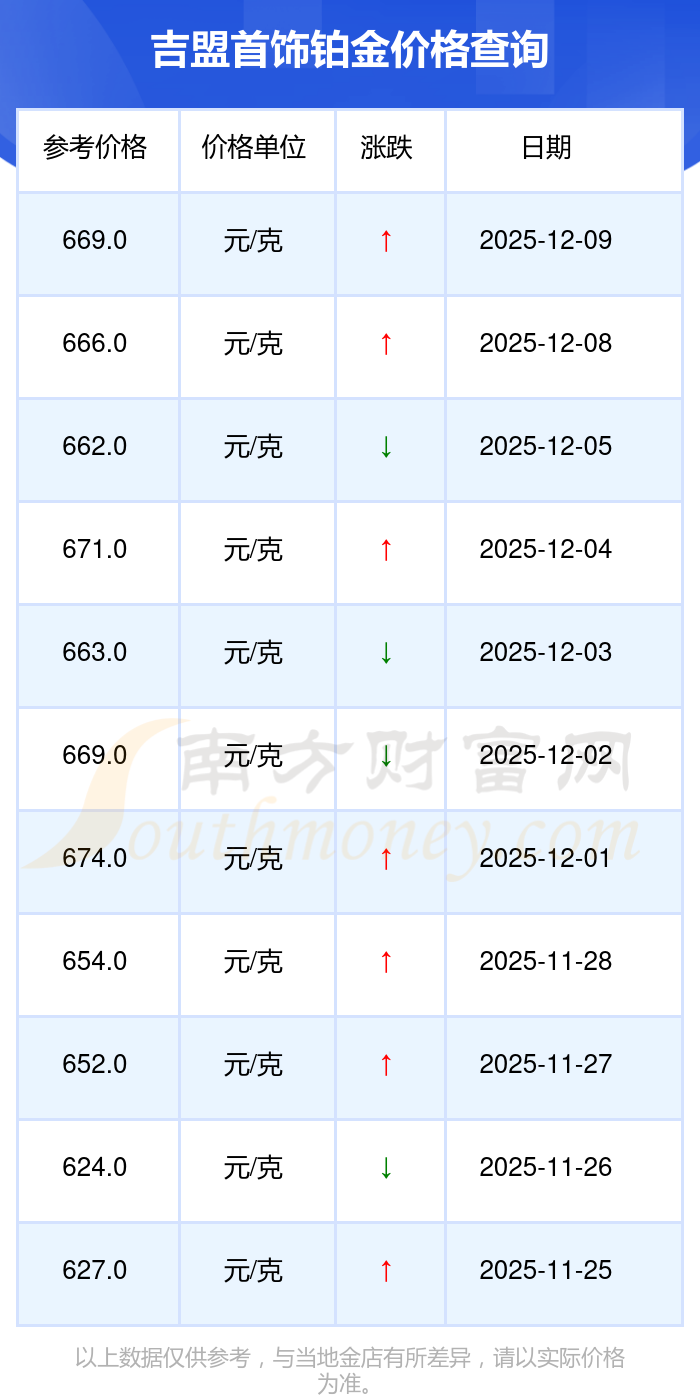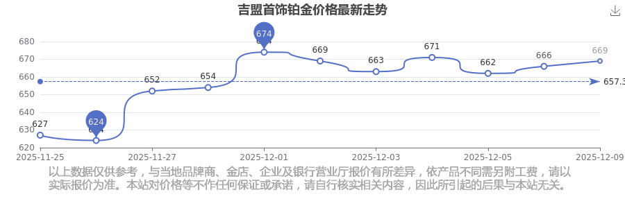 最新數(shù)據(jù)表明,吉盟首飾今日 鉑金價格為669.0元/克。