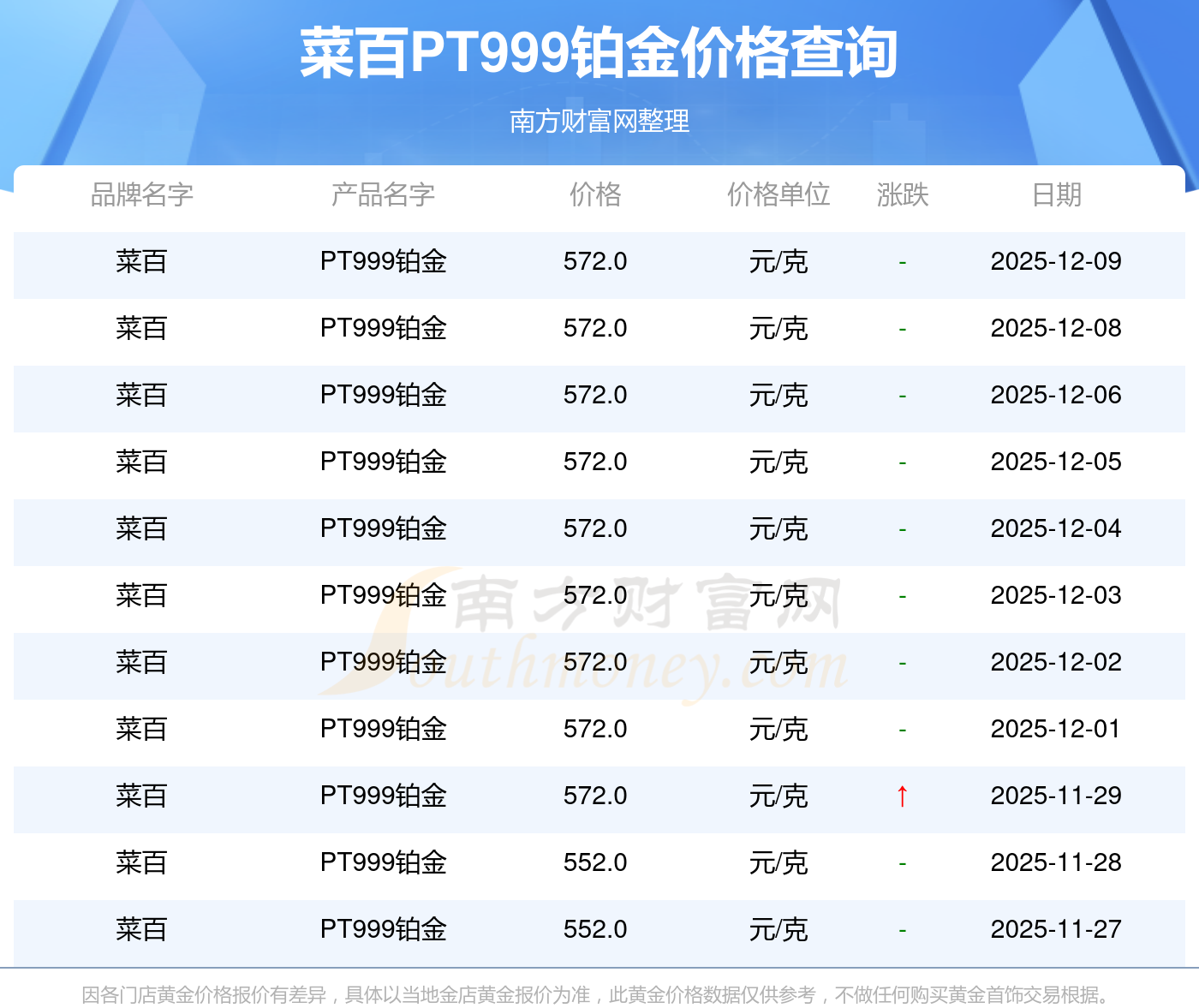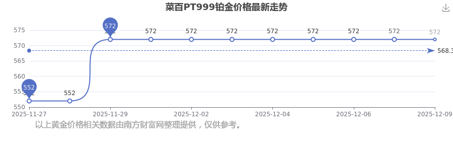 最新數(shù)據(jù)表明,菜百今日 PT999鉑金價(jià)格為572.0元/克。