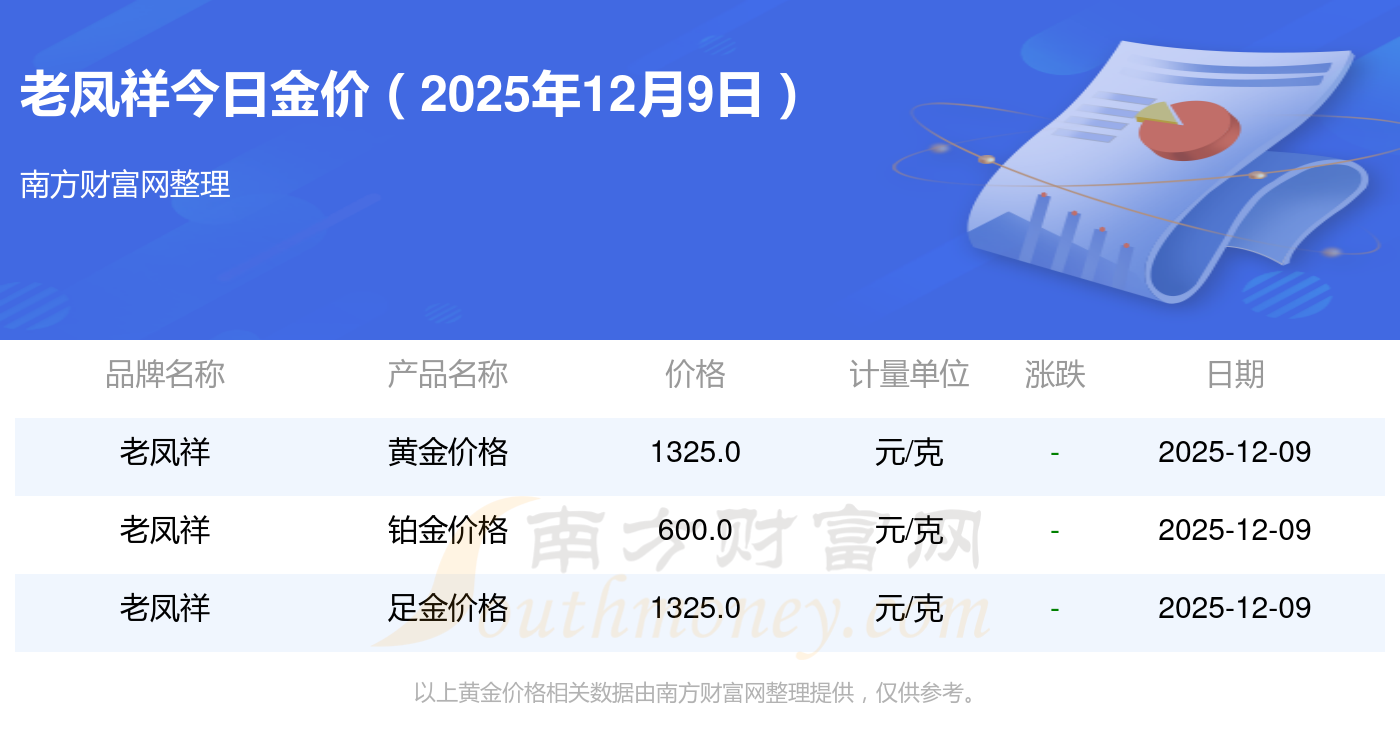 2025年12月9日老鳳祥今日價(jià)格:黃金價(jià)格1328.0元/克,鉑金價(jià)格669.0元/克,飾品金價(jià)(內(nèi)地)1328.0元/克,黃金飾品(香港)46520.0,鉑金價(jià)格(香港)19190.0,金條價(jià)格(香港)41960.0,金條金價(jià)(內(nèi)地)1165.0元/克,黃金價(jià)格1289.0元/克,鉑金價(jià)格613.0元/克,PT999鉑金價(jià)格613.0元/克,金條價(jià)格1184.0元/克。
