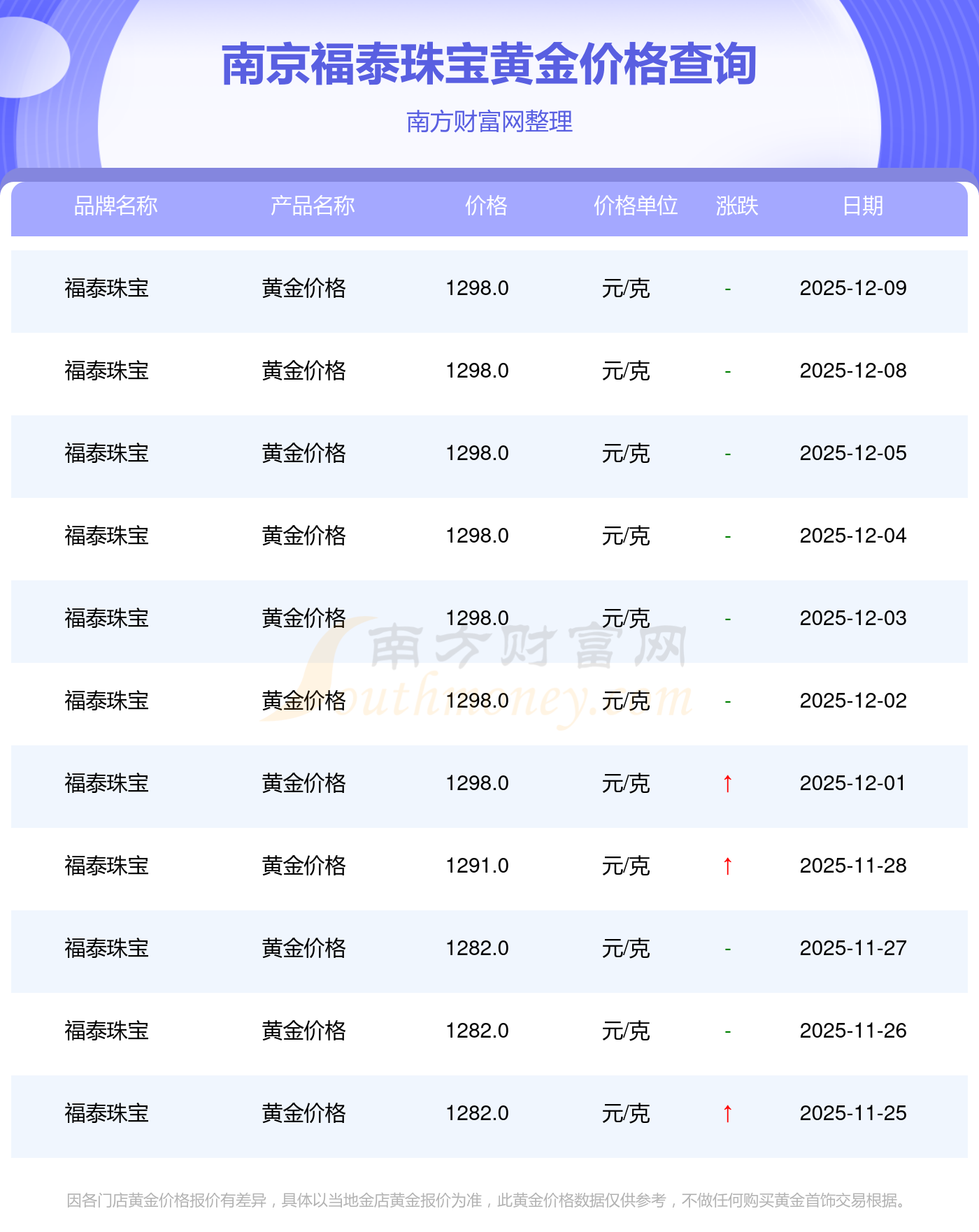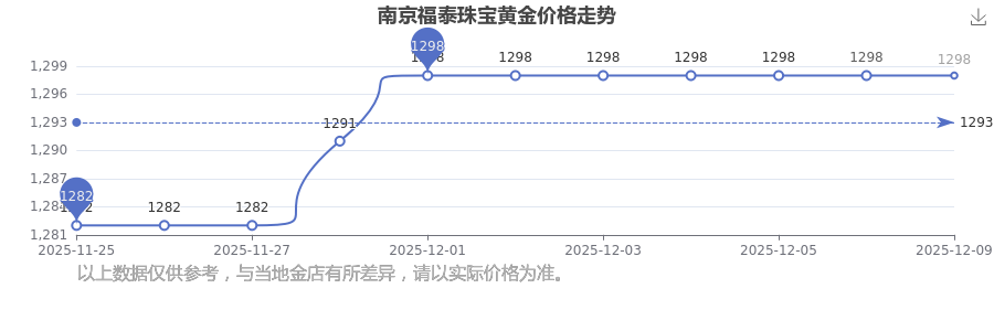 今日(2025年12月9日),南京福泰珠寶黃金價(jià)格的定價(jià)為 1298.0元/克。