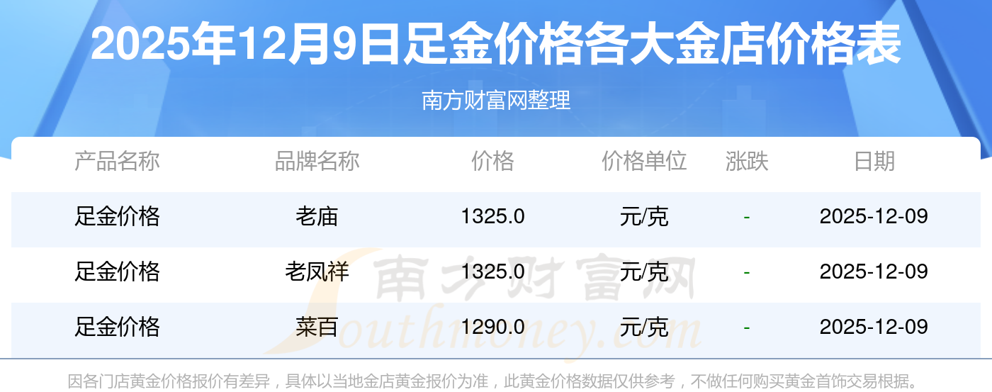 2025年12月9日周大福、周大福、周大福、周大福、周大福、周大福、周大福、周六福、周六福、周六福、周六福等各大金店品牌足金價格最新價格如下:周大福黃金價格1328.0元/克,周大福鉑金價格669.0元/克,周大福飾品金價(內(nèi)地)1328.0元/克,周大福黃金飾品(香港)46520.0,周大福鉑金價格(香港)19190.0,周大福金條價格(香港)41960.0,周大福金條金價(內(nèi)地)1165.0元/克,周六福黃金價格1289.0元/克,周六福鉑金價格613.0元/克,周六福PT999鉑金價格613.0元/克,周六福金條價格1184.0元/克。