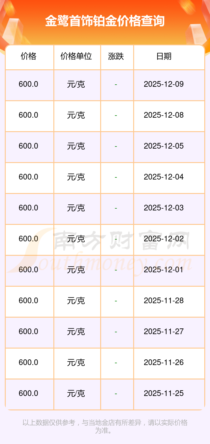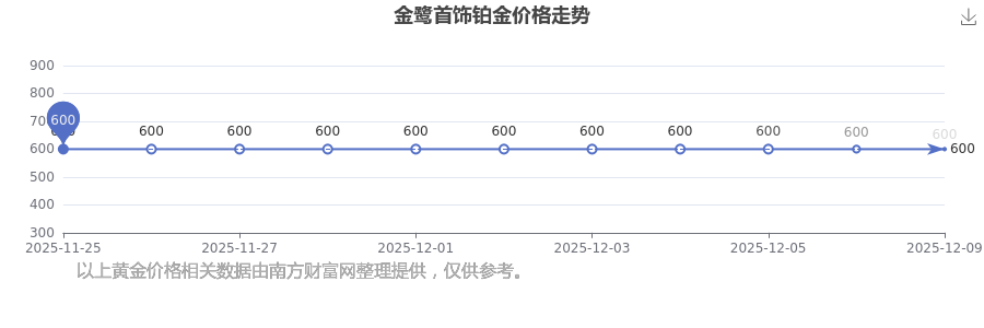 今日(2025年12月9日)金鷺首飾鉑金價(jià)格為600.0元/克。
