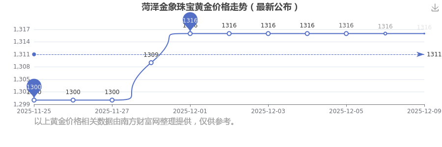 今日(2025年12月9日),菏澤金象珠寶黃金價(jià)格的定價(jià)為 1316.0元/克。
