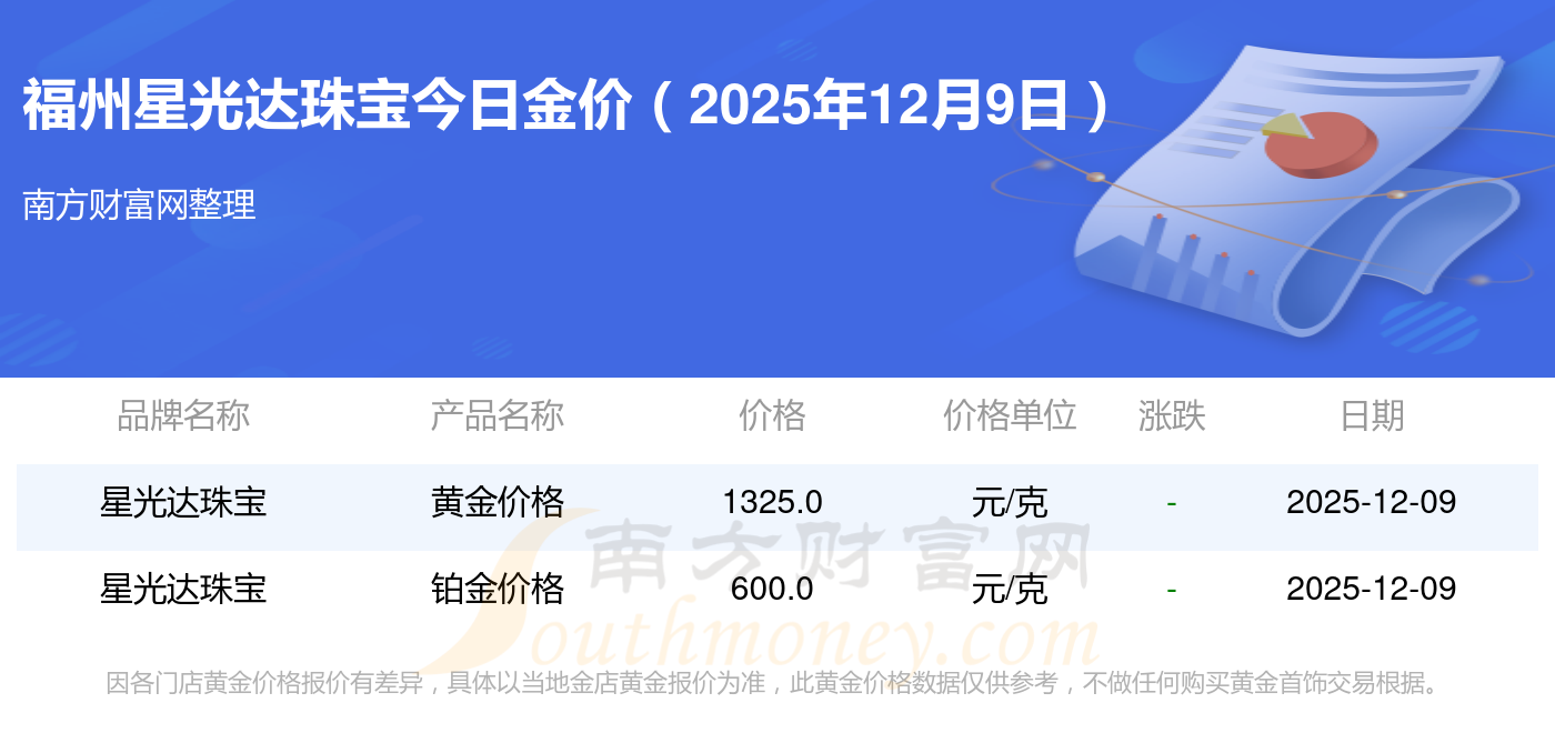 今日黃金價(jià)格查詢_現(xiàn)在金價(jià)黃金一克多少錢,黃金價(jià)格是多少錢一克?2025年12月9日福州星光達(dá)珠寶一克黃金的售價(jià)是多少:黃金價(jià)格1328.0元/克,鉑金價(jià)格669.0元/克,飾品金價(jià)(內(nèi)地)1328.0元/克,黃金飾品(香港)46520.0,鉑金價(jià)格(香港)19190.0,金條價(jià)格(香港)41960.0,金條金價(jià)(內(nèi)地)1165.0元/克,黃金價(jià)格1289.0元/克,鉑金價(jià)格613.0元/克,PT999鉑金價(jià)格613.0元/克,金條價(jià)格1184.0元/克。