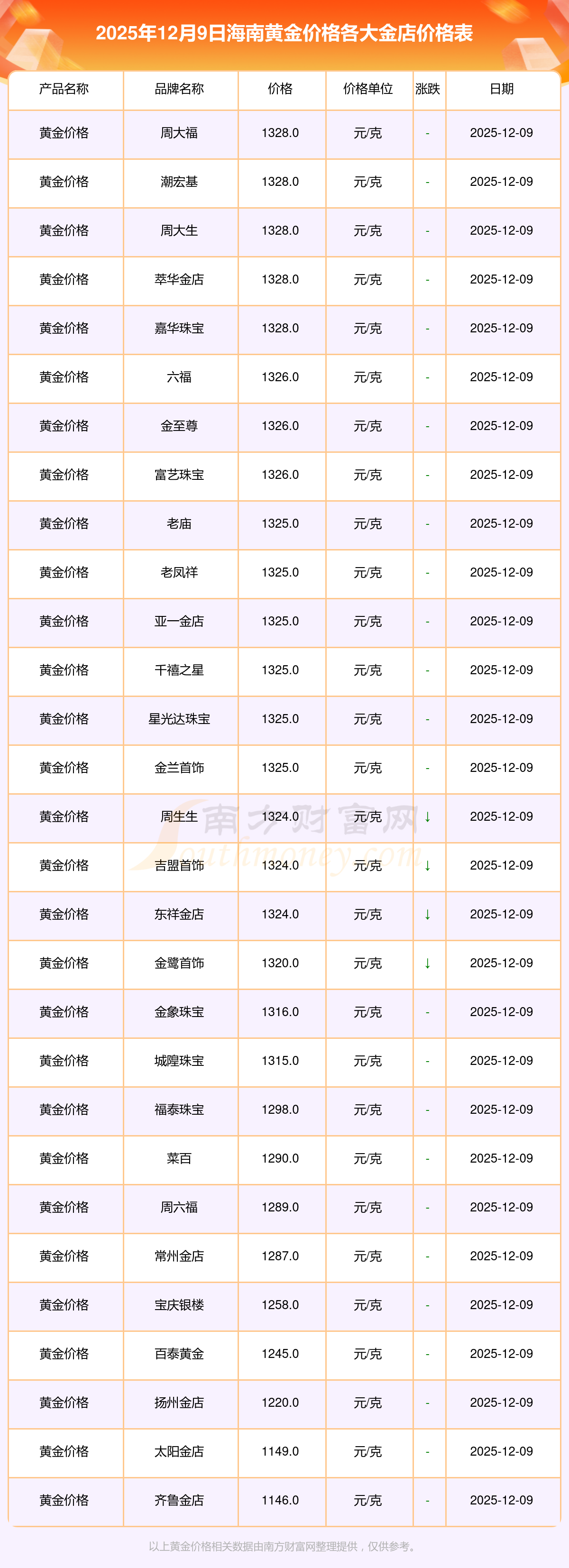 今天是2025年12月9日,海南周大福、周大福、周大福、周大福、周大福、周大福、周大福、周六福、周六福、周六福、周六福等各大金店品牌黃金價格最新價格如下:周大福1328.0元/克、周大福669.0元/克、周大福1328.0元/克、周大福46520.0、周大福19190.0、周大福41960.0、周大福1165.0元/克、周六福1289.0元/克、周六福613.0元/克、周六福613.0元/克、周六福1184.0元/克。