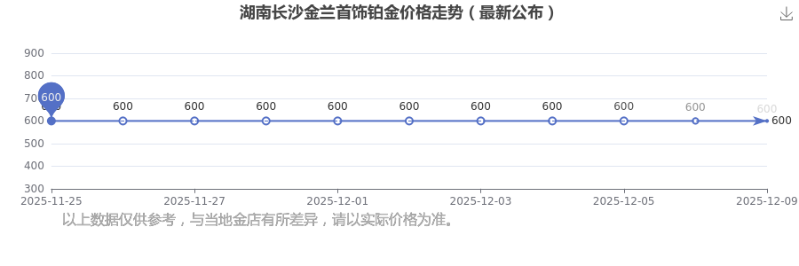 今日(2025年12月9日),600.0元/克是湖南長沙金蘭首飾鉑金價(jià)格的價(jià)格標(biāo)準(zhǔn)。