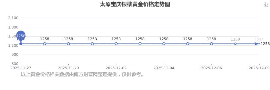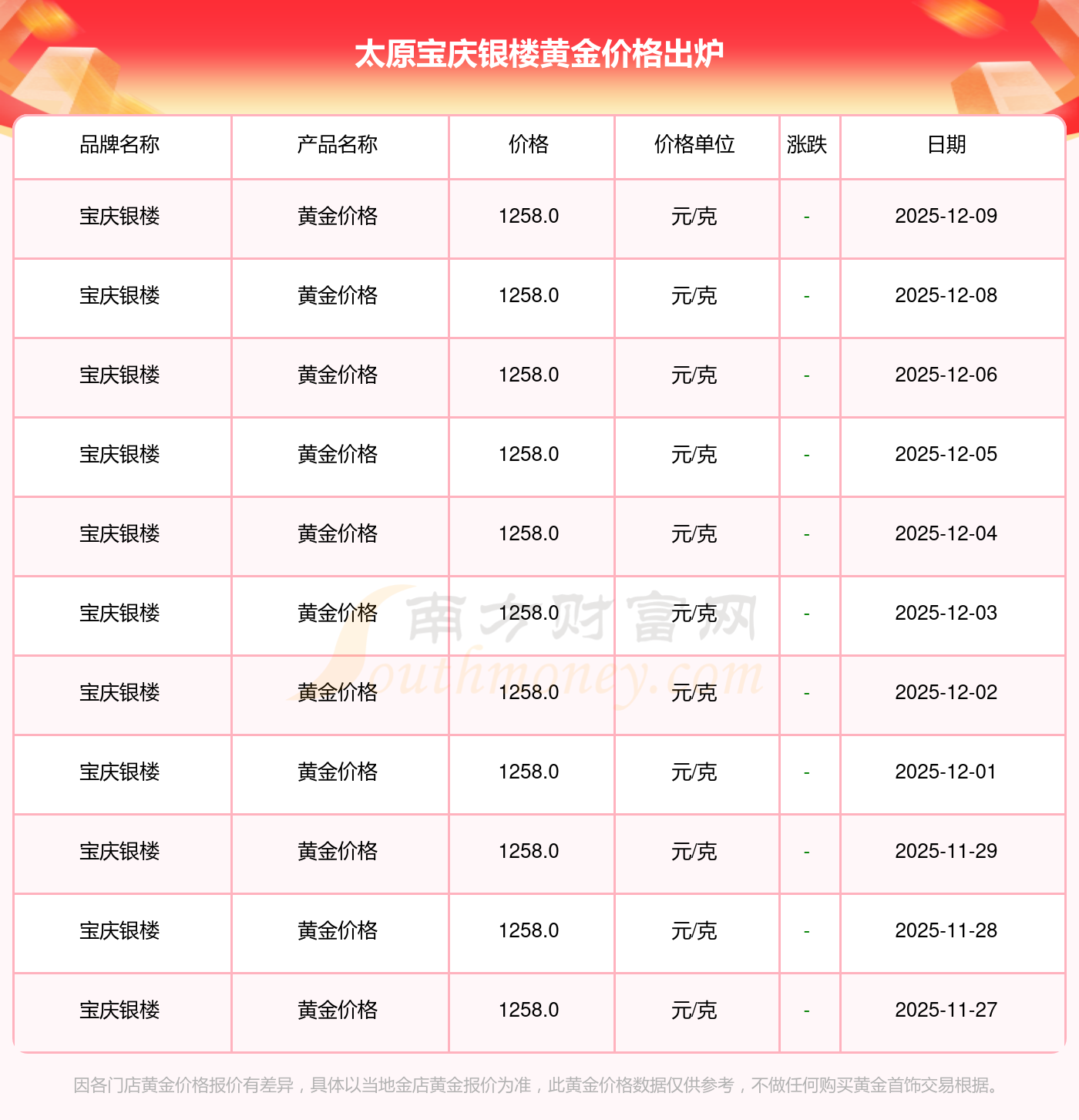 今日(2025年12月9日),1258.0元/克是太原寶慶銀樓黃金價格的價格標準。