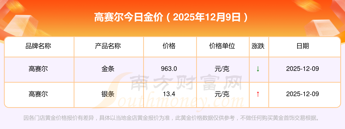 高賽爾今日黃金價格行情如何:黃金價格1328.0元/克,鉑金價格669.0元/克,飾品金價(內地)1328.0元/克,黃金飾品(香港)46520.0,鉑金價格(香港)19190.0,金條價格(香港)41960.0,金條金價(內地)1165.0元/克,黃金價格1289.0元/克,鉑金價格613.0元/克,PT999鉑金價格613.0元/克,金條價格1184.0元/克。