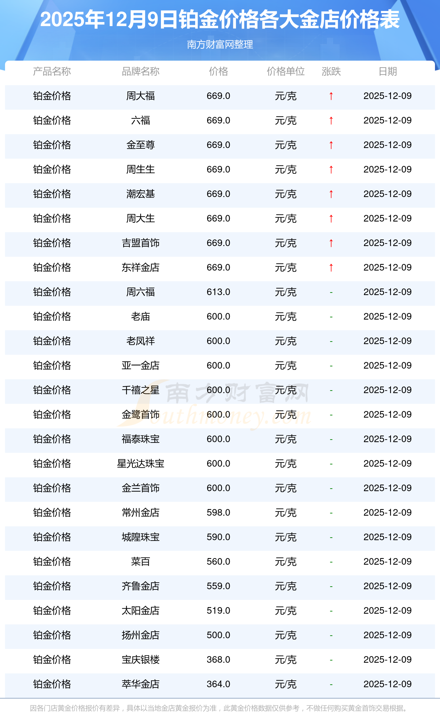 今天是2025年12月9日,周大福、周大福、周大福、周大福、周大福、周大福、周大福、周六福、周六福、周六福、周六福等各大金店品牌鉑金價(jià)格最新價(jià)格如下:周大福1328.0元/克、周大福669.0元/克、周大福1328.0元/克、周大福46520.0、周大福19190.0、周大福4196