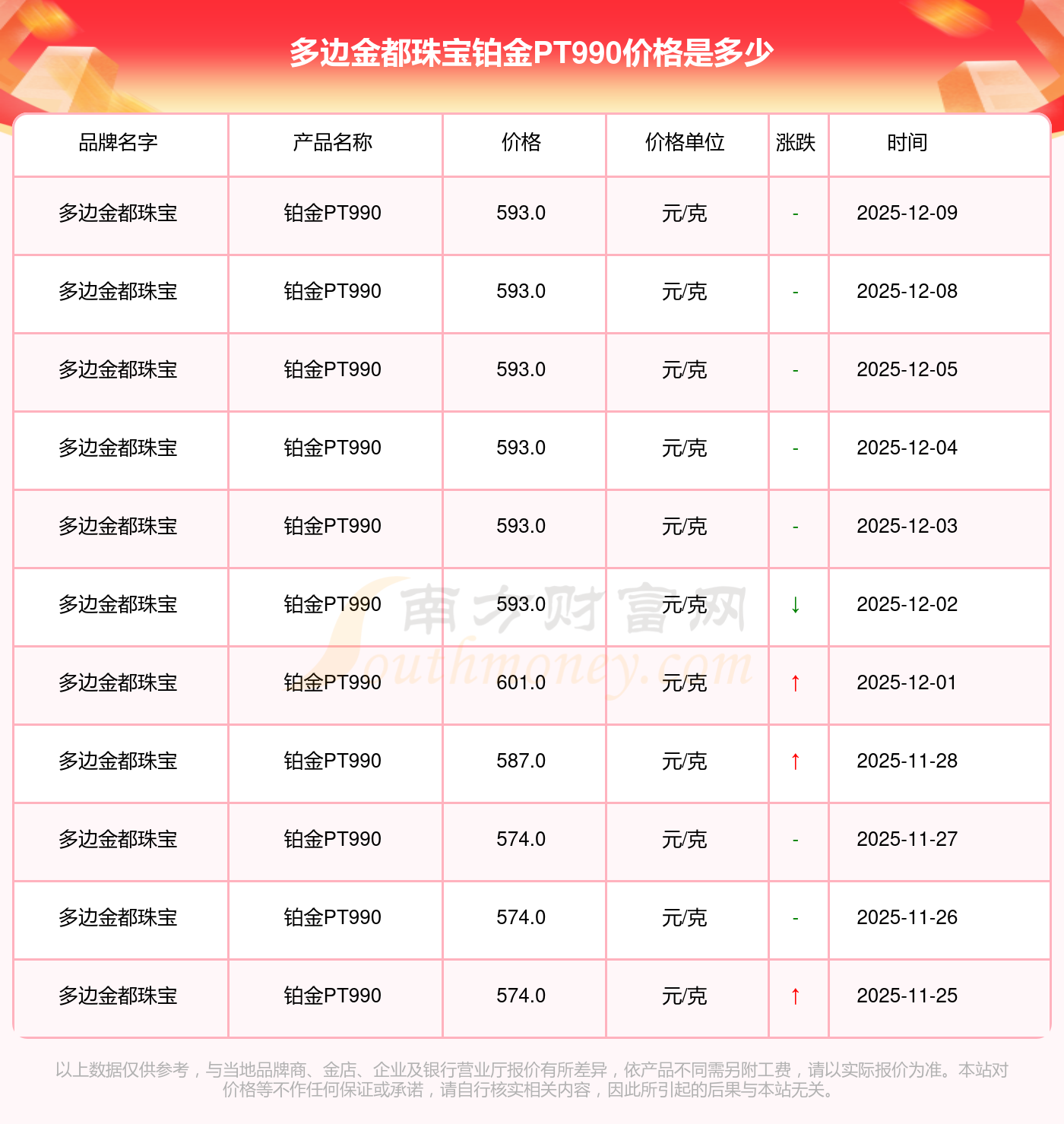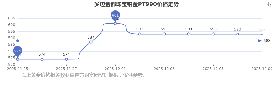 2025年12月9日多邊金都珠寶鉑金PT990價格為593.0元/克。