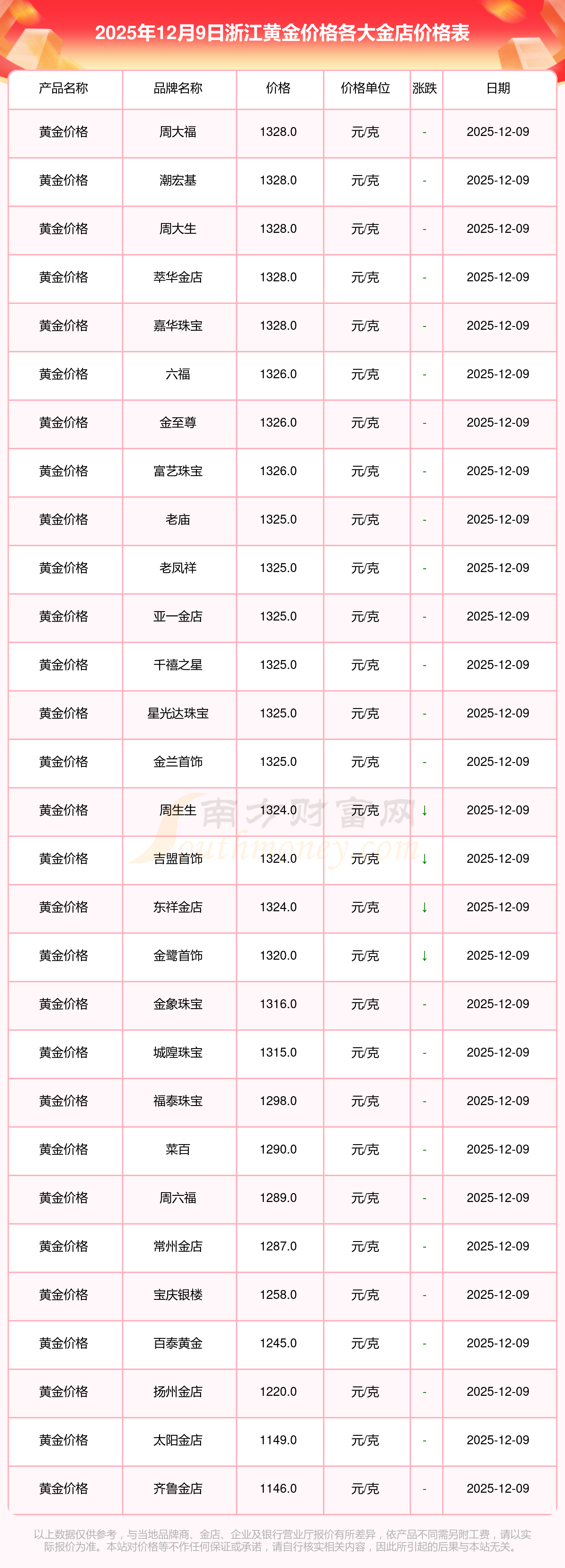 2025年12月9日浙江各大金店黃金價格最新價格查詢來了:周大福1328.0元/克,周大福669.0元/克,周大福1328.0元/克,周大福46520.0,周大福19190.0,周大福41960.0,周大福1165.0元/克,周六福1289.0元/克,周六福613.0元/克,周六福613.0元/克,周六福1184.0元/克。