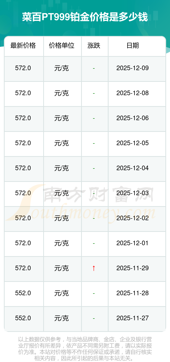 今日菜百PT999鉑金價格最新為572.0元/克。