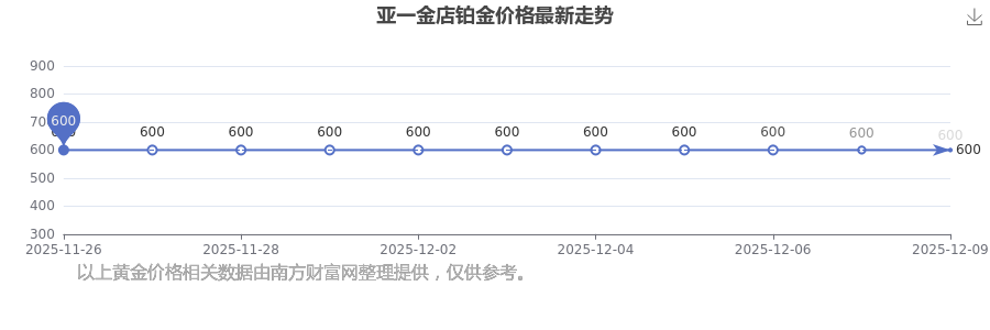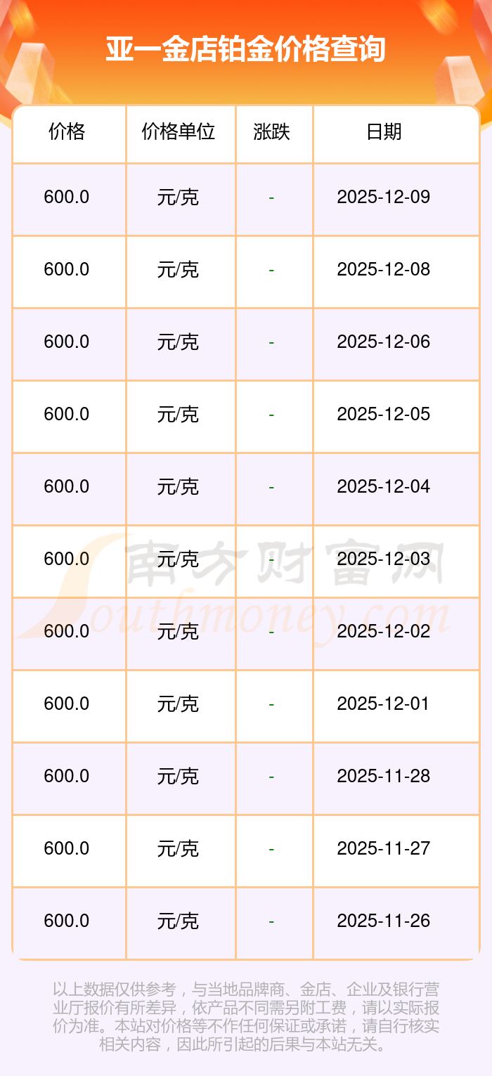 今日亞一金店鉑金價(jià)格為600.0元/克。