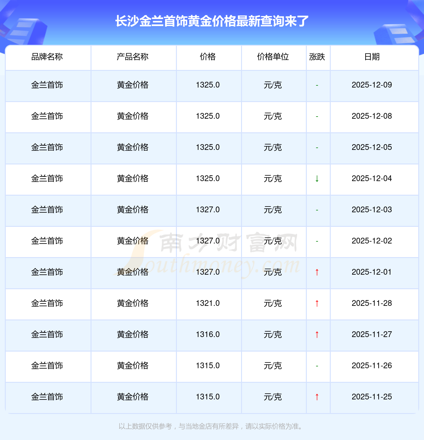 今日長沙金蘭首飾黃金價(jià)格查詢,(2025年12月9日)今日長沙金蘭首飾黃金價(jià)格是1325.0元/克。