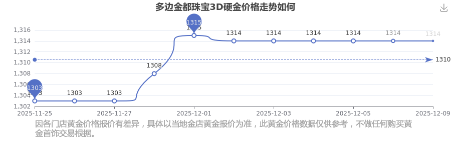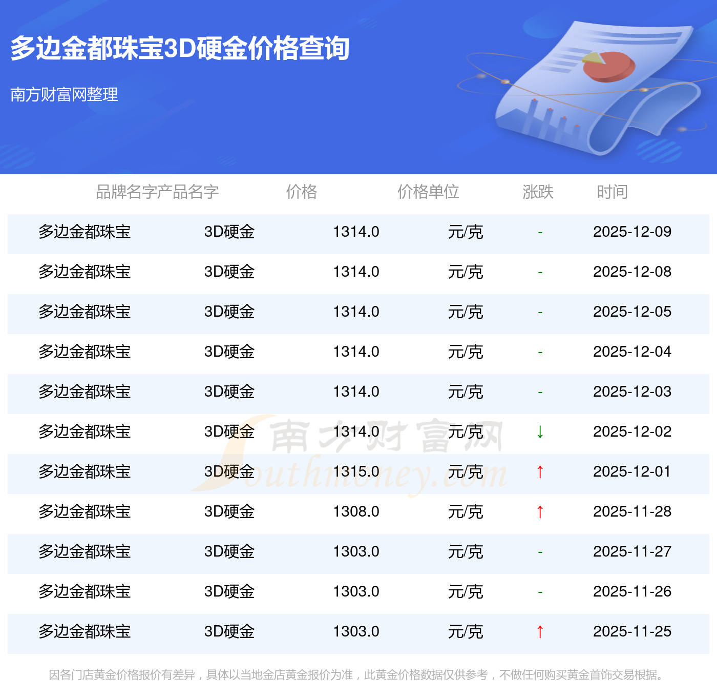 今日(2025年12月9日)多邊金都珠寶3D硬金價(jià)格:1314.0元/克。