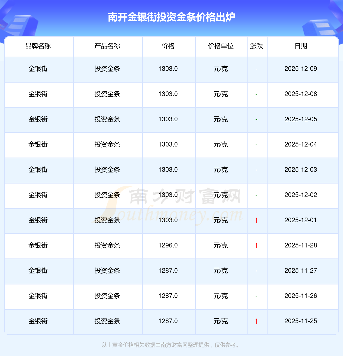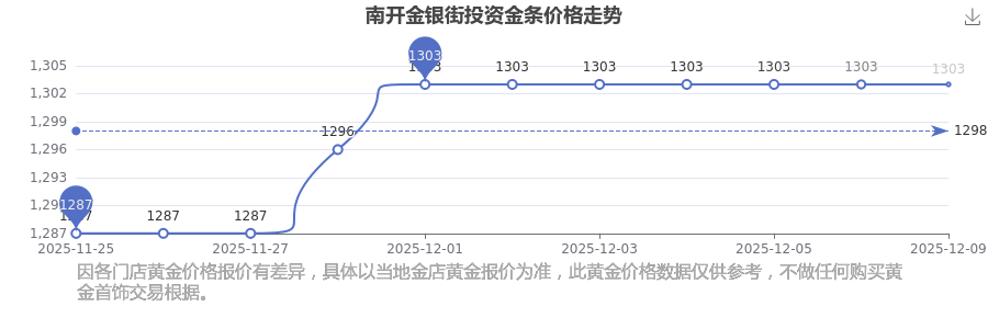 2025年12月9日,南開金銀街的投資金條標(biāo)價達到 1303.0元/克。