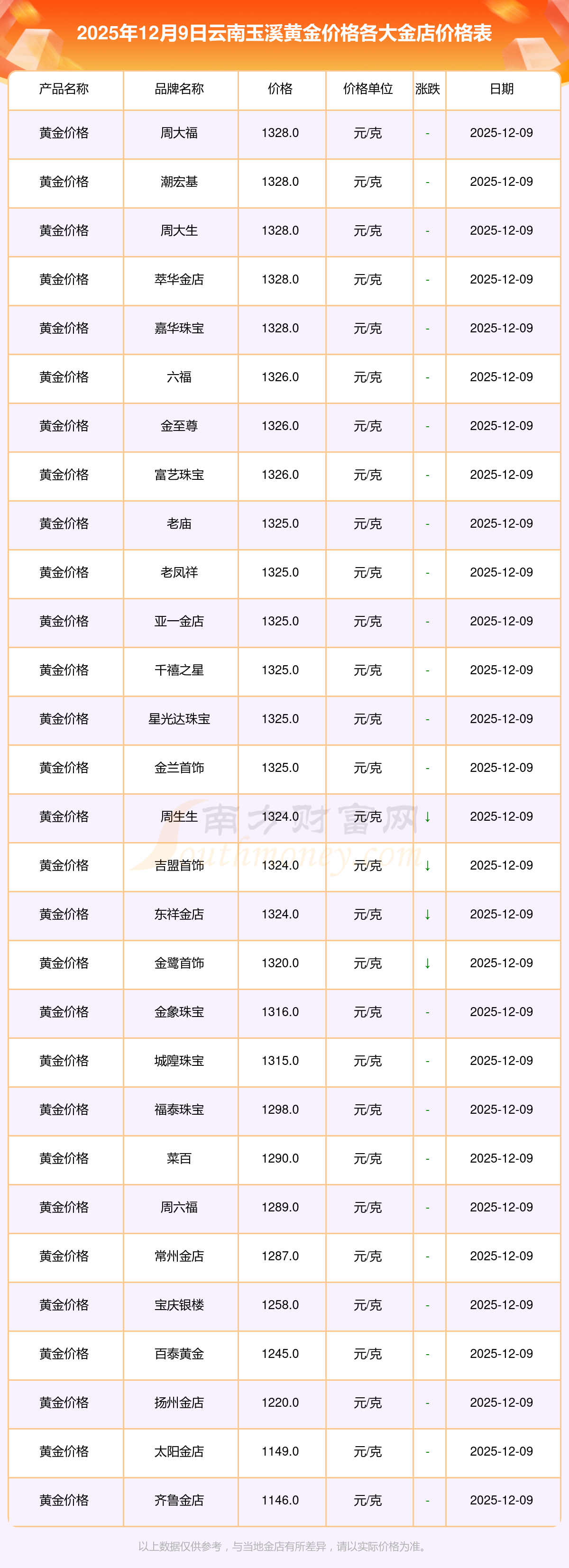 2025年12月9日云南玉溪周大福、周大福、周大福、周大福、周大福、周大福、周大福、周六福、周六福、周六福、周六福等各大金店品牌黃金價(jià)格最新價(jià)格如下:周大福黃金價(jià)格1328.0元/克,周大福鉑金價(jià)格669.0元/克,周大福飾品金價(jià)(內(nèi)地)1328.0元/克,周大福黃金飾品(香港)46520.0,周大福鉑金價(jià)格(香港)19190.0,周大福金條價(jià)格(香港)41960.0,周大福金條金價(jià)(內(nèi)地)1165.0元/克,周六福黃金價(jià)格1289.0元/克,周六福鉑金價(jià)格613.0元/克,周六福PT999鉑金價(jià)格613.0元/克,周六福金條價(jià)格1184.0元/克。