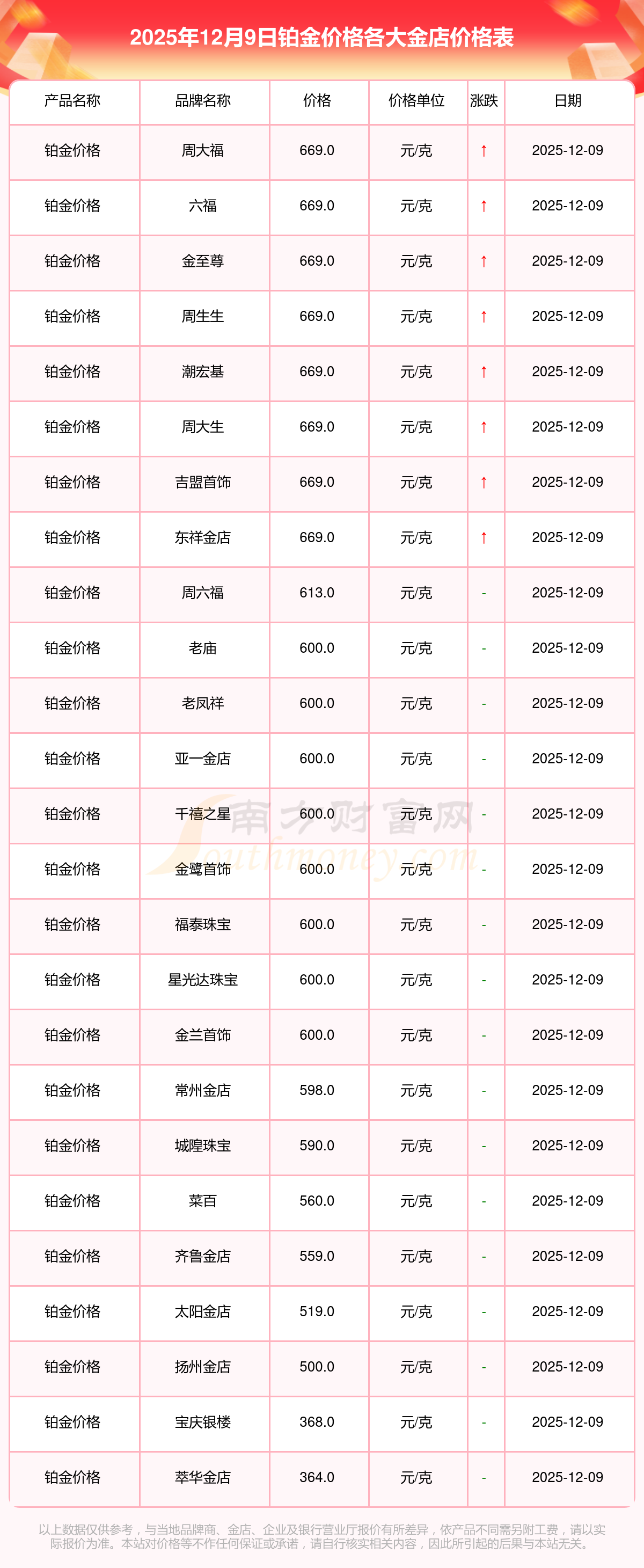 2025年12月9日周大福、周大福、周大福、周大福、周大福、周大福、周大福、周六福、周六福、周六福、周六福等各大金店品牌鉑金價格最新價格如下:周大福黃金價格1328.0元/克,周大福鉑金價格669.0元/克,周大福飾品金價(內(nèi)地)1328.0元/克,周大福黃金飾品(香港)46520.0,周大福鉑金價格(香港)19190.0,周大福金條價格(香港)41960.0,周大福金條金價(內(nèi)地)1165.0元/克,周六福黃金價格1289.0元/克,周六福鉑金價格613.0元/克,周六福PT999鉑金價格613.0元/克,周六福金條價格1184.0元/克。