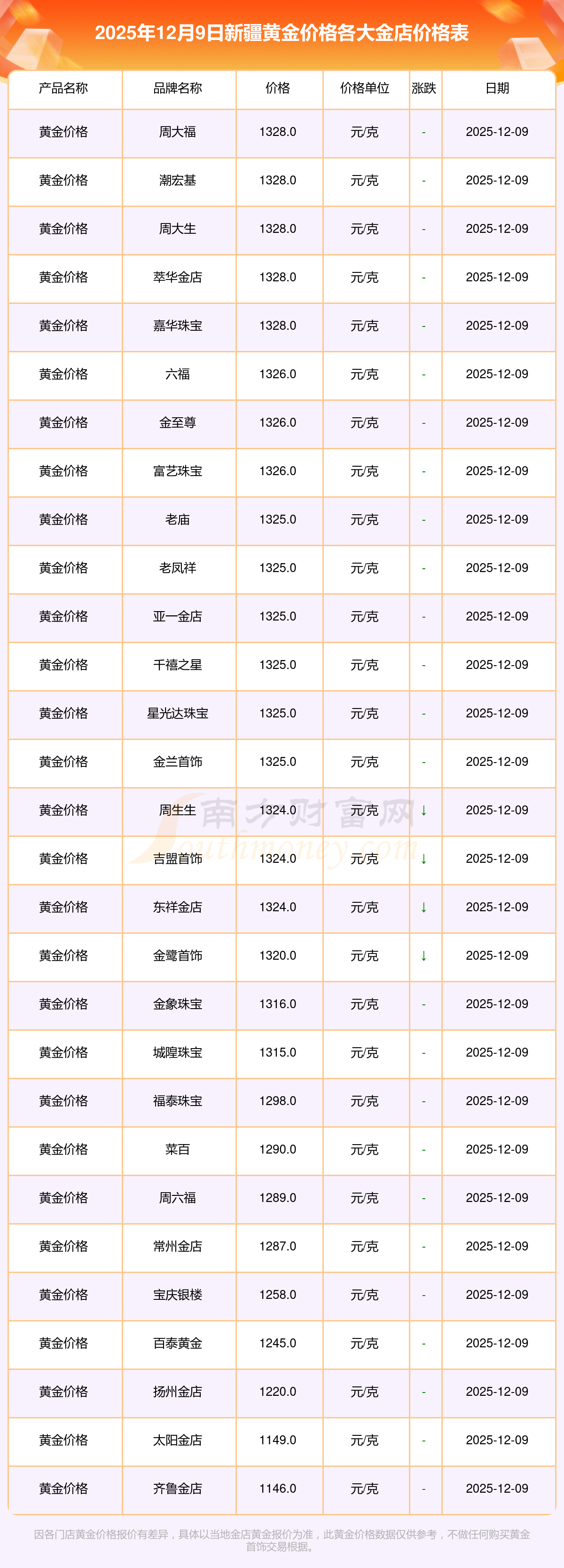 2025年12月9日,新疆周大福、周大福、周大福、周大福、周大福、周大福、周大福、周六福、周六福、周六福、周六福等各大金店品牌黃金價格今日價格行情最新來了:周大福1328.0元/克、周大福669.0元/克、周大福1328.0元/克、周大福46520.0、周大福19190.0、周大福41960.0、周大福1165.0元/克、周六福1289.0元/克、周六福613.0元/克、周六福613.0元/克、周六福1184.0元/克。