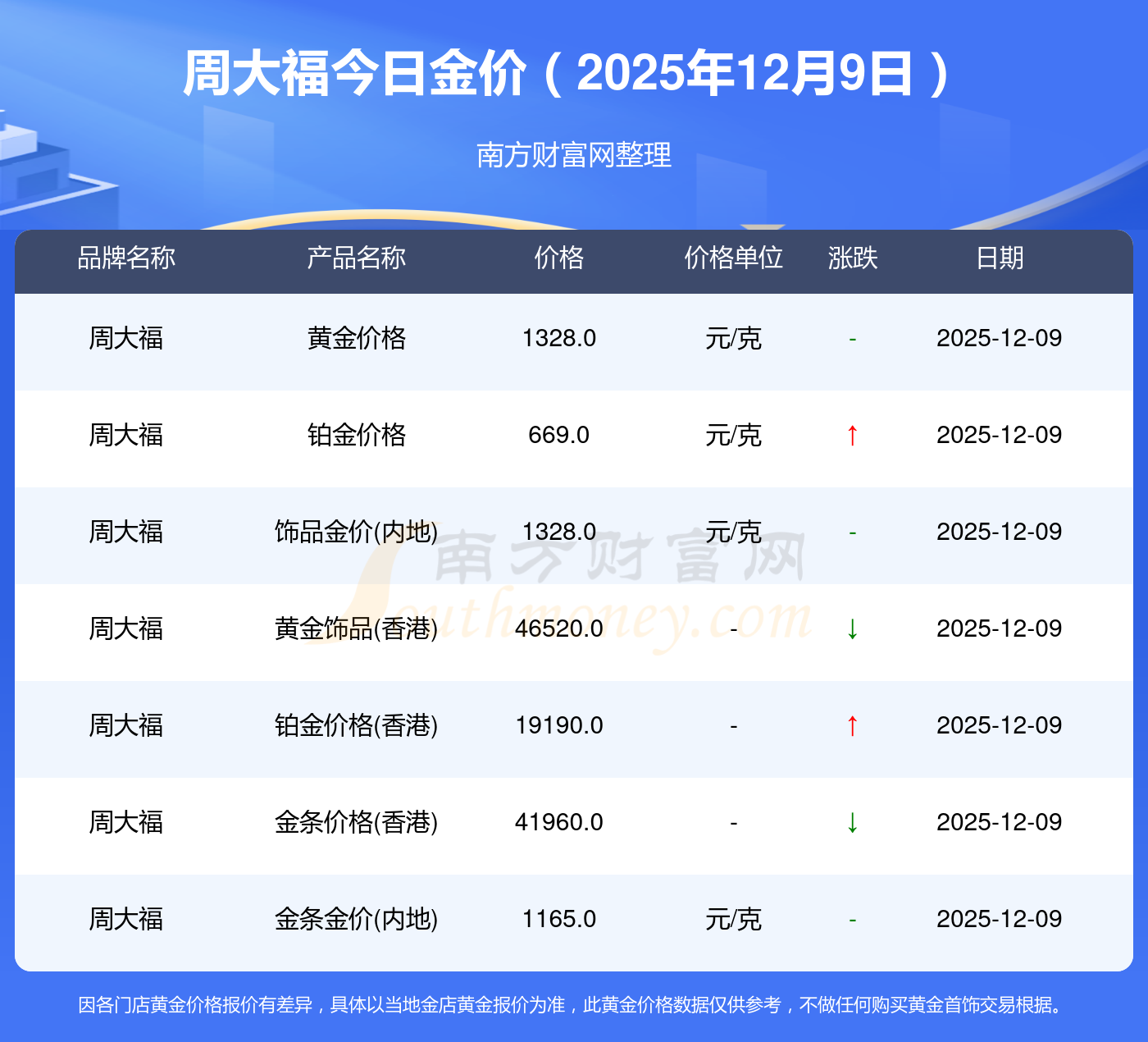 2025年12月9日周大福最新價格:黃金價格1328.0元/克,鉑金價格669.0元/克,飾品金價(內(nèi)地)1328.0元/克,黃金飾品(香港)46520.0,鉑金價格(香港)19190.0,金條價格(香港)41960.0,金條金價(內(nèi)地)1165.0元/克,黃金價格1289.0元/克,鉑金價格613.0元/克,PT999鉑金價格613.0元/克,金條價格1184.0元/克。