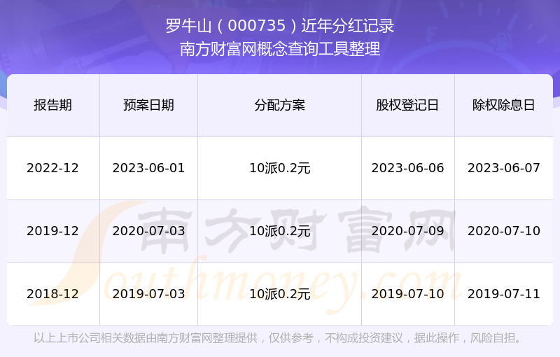 羅牛山最新一次公布的分紅方案為10派0.2元。本次權(quán)益分派股權(quán)登記日為2023年6月6日,除權(quán)除息日為2023年6月7日,派息日為2023年6月7日。