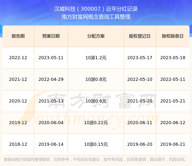 漢威科技最新一次公布的分紅方案為10派1.2元。本次權(quán)益分派股權(quán)登記日為2023年5月17日,除權(quán)除息日為2023年5月18日,派息日為2023年5月18日。
