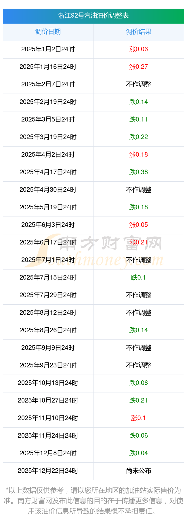 12月18日,浙江92號(hào)汽油的價(jià)格是6.82元每升,本次的調(diào)整時(shí)間為12月9日,對(duì)比上次的調(diào)整下跌了0.04元,下跌0.583%,12月22日24時(shí)為下一輪油價(jià)調(diào)整時(shí)間,還有4.68天。