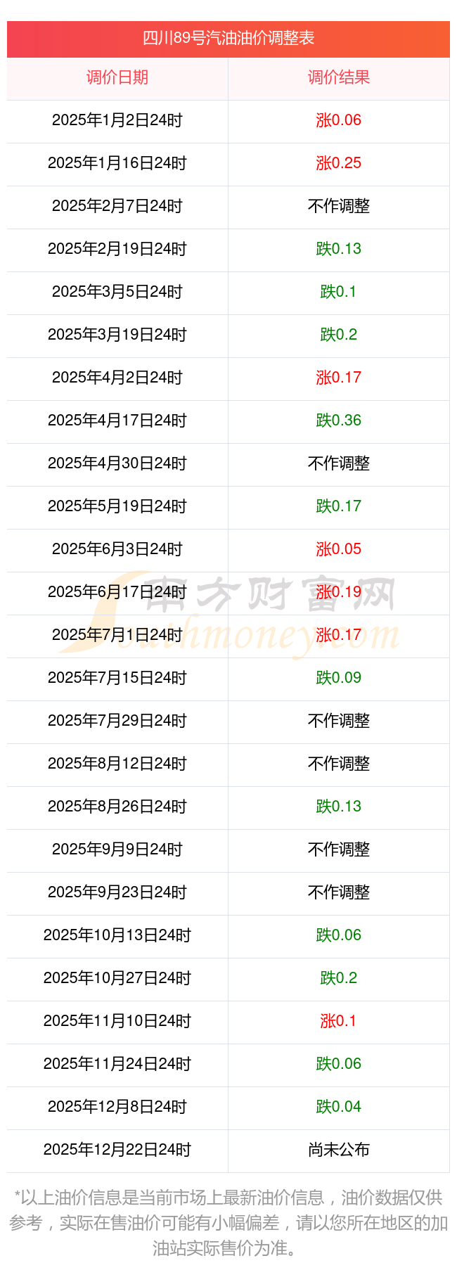 四川89號(hào)汽油油價(jià)調(diào)整表