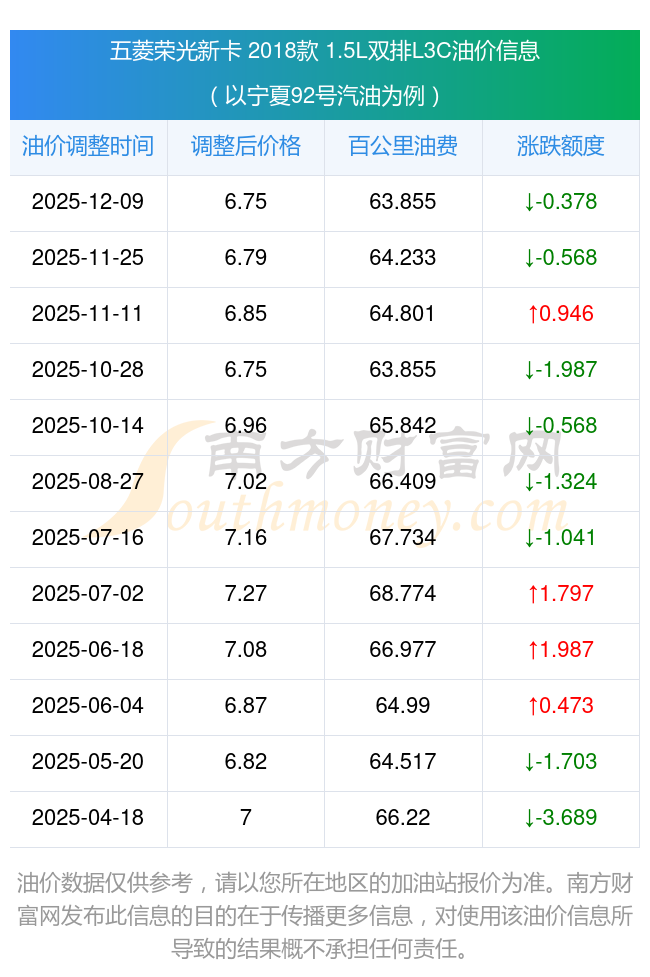 按12月9日92號汽油最新調(diào)整價格6.75元每升來計算(以寧夏為例),該車型百公里平均油費為63.855元,按上一輪11月25日調(diào)整價格6.79元每升來計算,百公里平均油費為64.233元,對比上一輪少花0.378元,下一輪油價調(diào)整時間為12月22日24時。